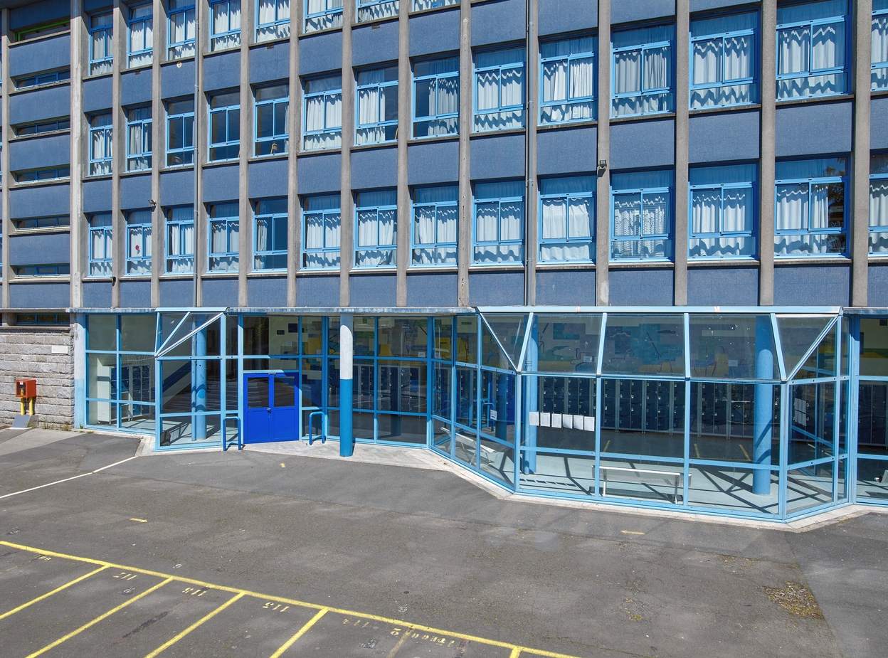 Externat : vue partielle de la façade ouest. Georges Tourry et Hervé Péron, architectes, 1963. Le préau a été fermé à la fin des années 1980 ou au début des années 1990.Immatriculation