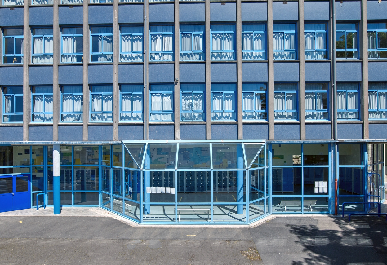Externat : vue partielle de la façade ouest. Georges Tourry et Hervé Péron, architectes, 1963. Le préau a été fermé à la fin des années 1980 ou au début des années 1990.Immatriculation