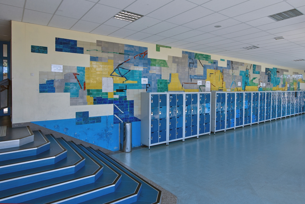 Céramique de René Maurès, sur le mur du préau ouest, 1967-1970 : vue d'ensemble prise du nord.Immatriculation