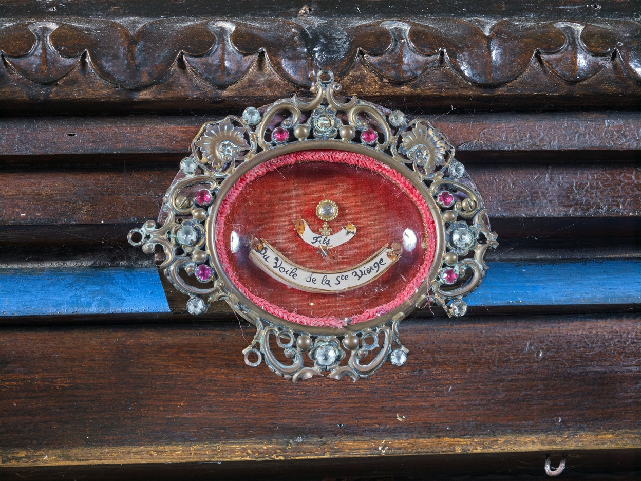 Détail du reliquaire des fils du voile de la Vierge, socle de la statue de Notre-Dame de Ty mam DouéImmatriculation