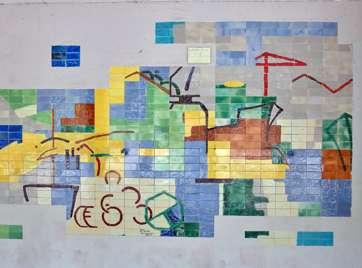 Céramique de René Maurès, sur le mur du préau est, 1967-1970 : détail.Immatriculation