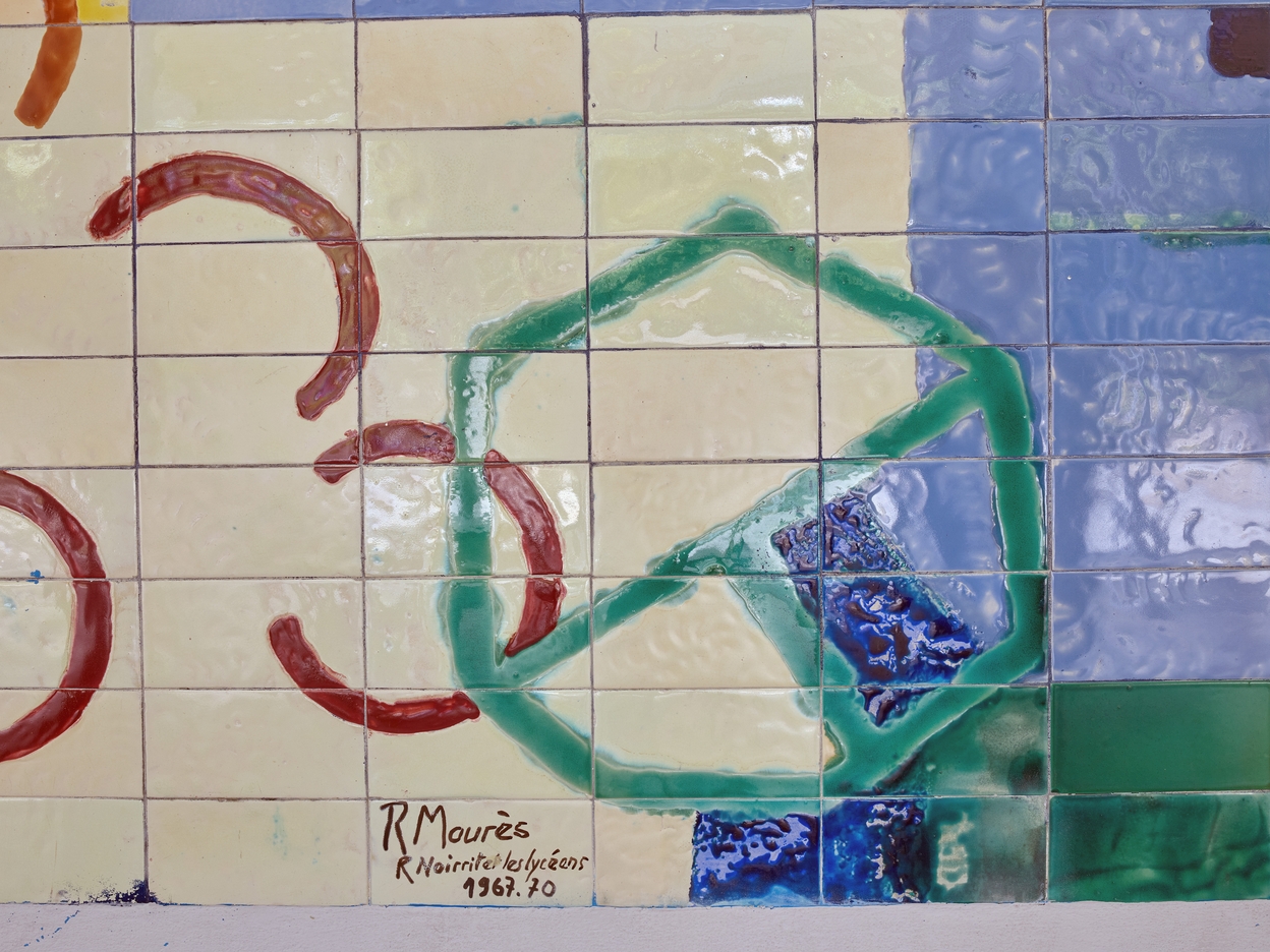 Céramique de René Maurès, sur le mur du préau est, 1967-1970 : détail sur la signature.Immatriculation