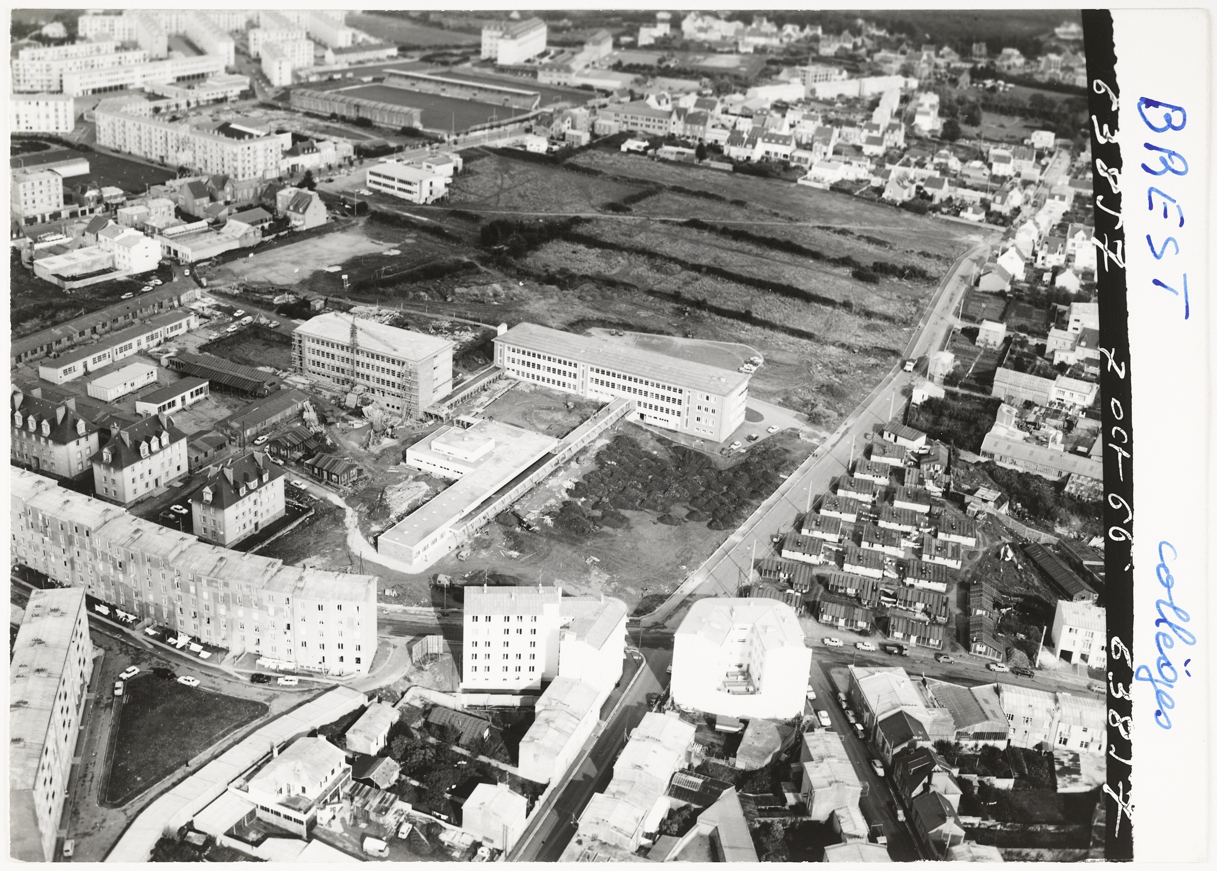 Vue aérienne prise du sud-ouest le 7 octobre 1966. La première tranche de travaux est achevée (externat 1er cycle et restauration), la deuxième en cours de construction (externat 2e cycle, partie sud). Plusieurs classes "en baraques" sont encore en place (à rapprocher du plan ci-dessus : IVR53_20212805079A0).Immatriculation