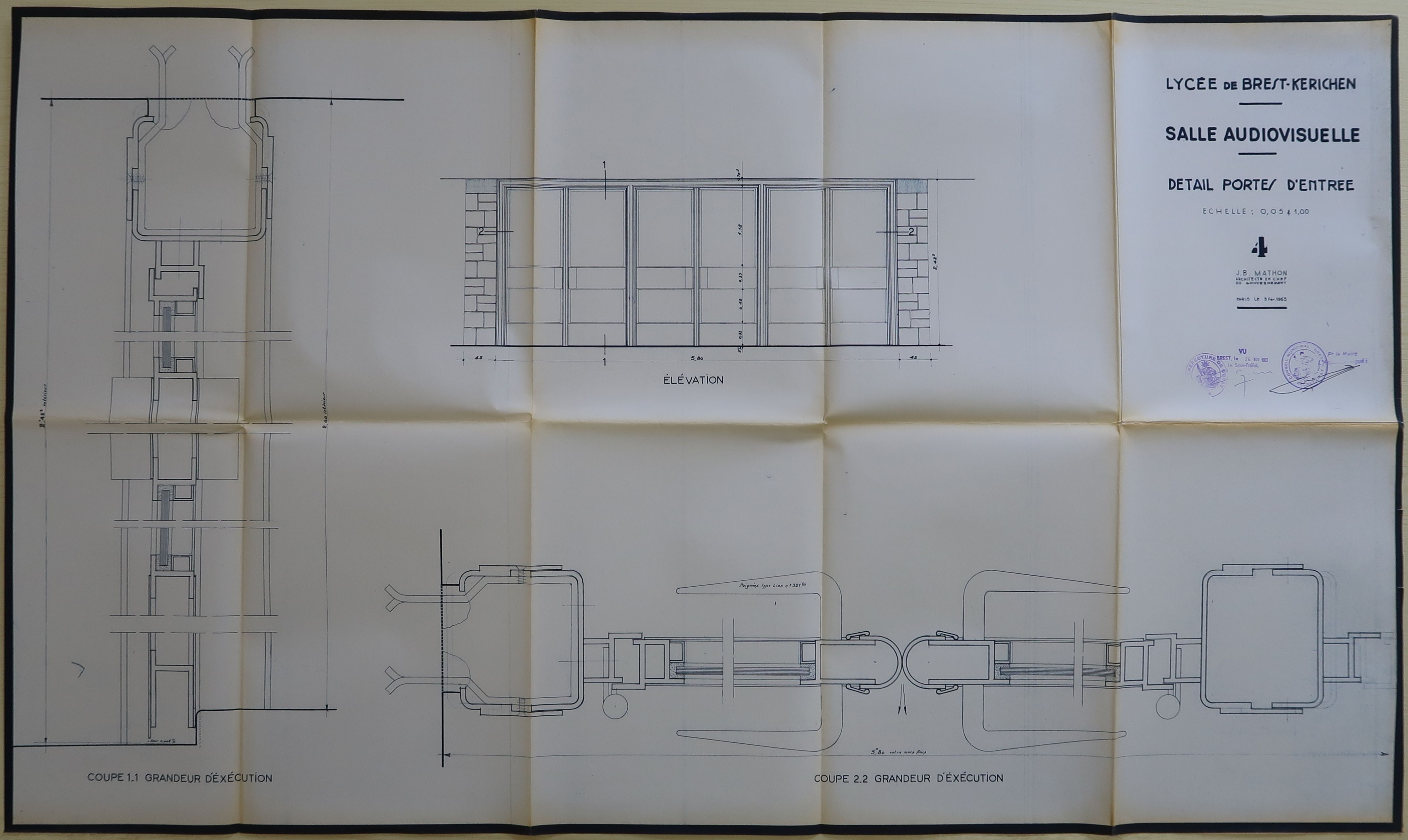 Salle audiovisuelle. Détail portes d'entrée. Jean-Baptiste Mathon, architecte, 5 février 1963.Immatriculation
