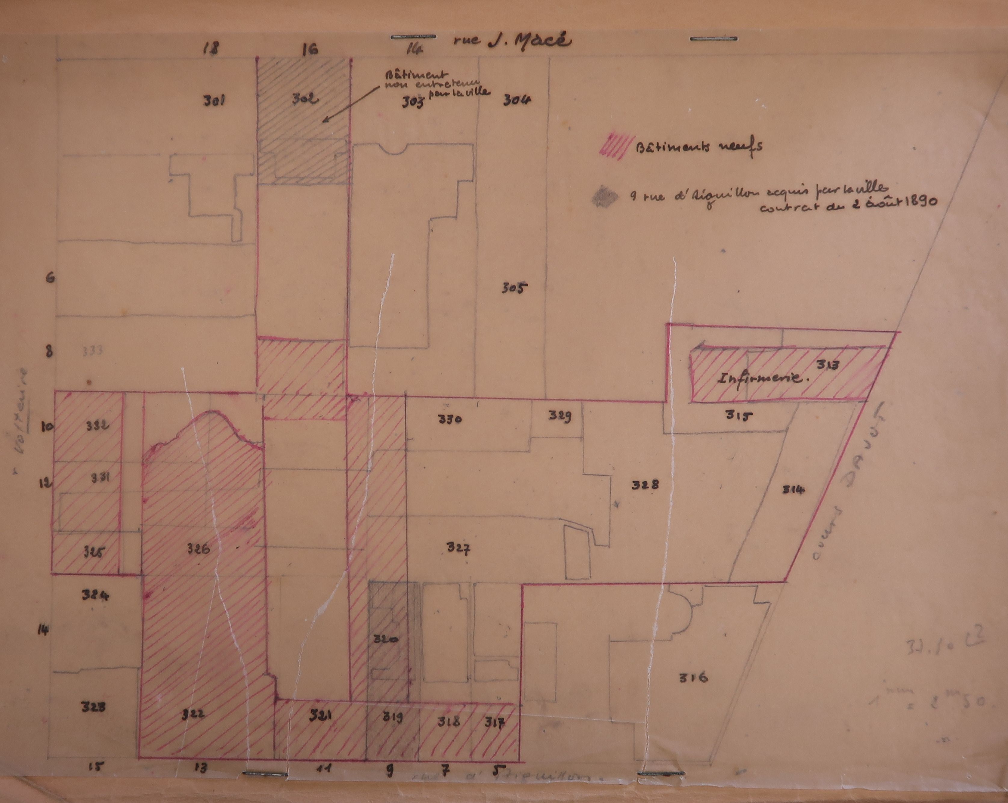 Plan d'ensemble du "petit lycée" détruit par les bombardements de la Seconde Guerre mondiale. Il pourrait avoir servi lors du conflit sur la propriété des dommages de guerre, entre la Ville et le Lycée, puisque y sont différenciés des "bâtiments non entretenus par la Ville", d'autres "acquis par la Ville", et d'autres "neufs". Noter que l'établissement occupe la quasi totalité d'un îlot urbain, et que la chapelle constitue une part importante du bâti.Immatriculation