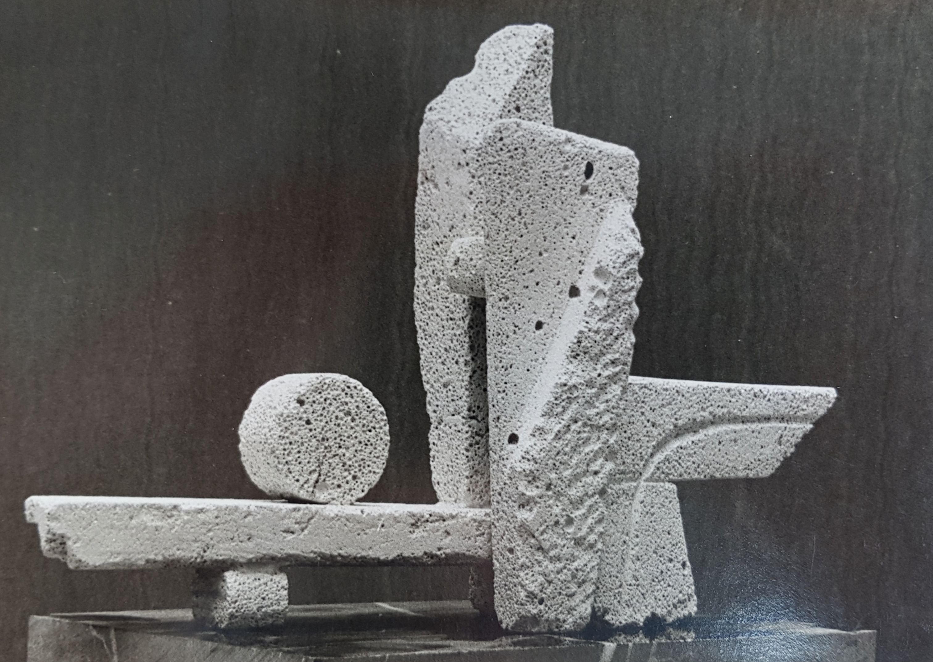 Maquette d'un projet de sculpture de Robert Fachard, non réalisé. Au dos : "Sculpture Lycée Carhaix vue face" . "Périmé visite Fachard le 7.1.71" + cachet de Robert Fachard.Immatriculation