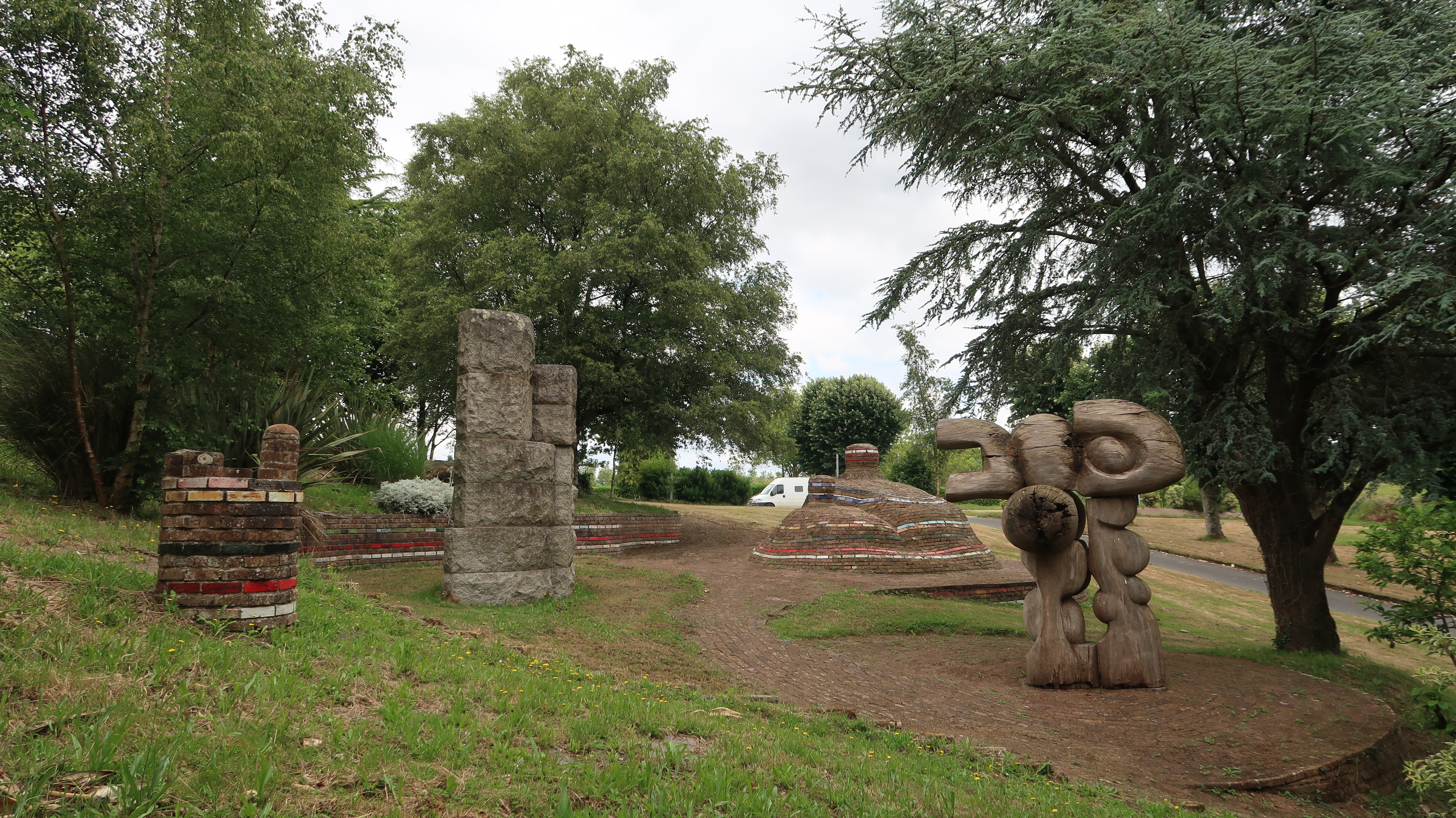 Vue d'ensemble prise en direction du plateau sportif. De gauche à droite, sculptures de Klaus Schultze, Robert Fachard, Klaus Schultze et Fumio Otani.Immatriculation