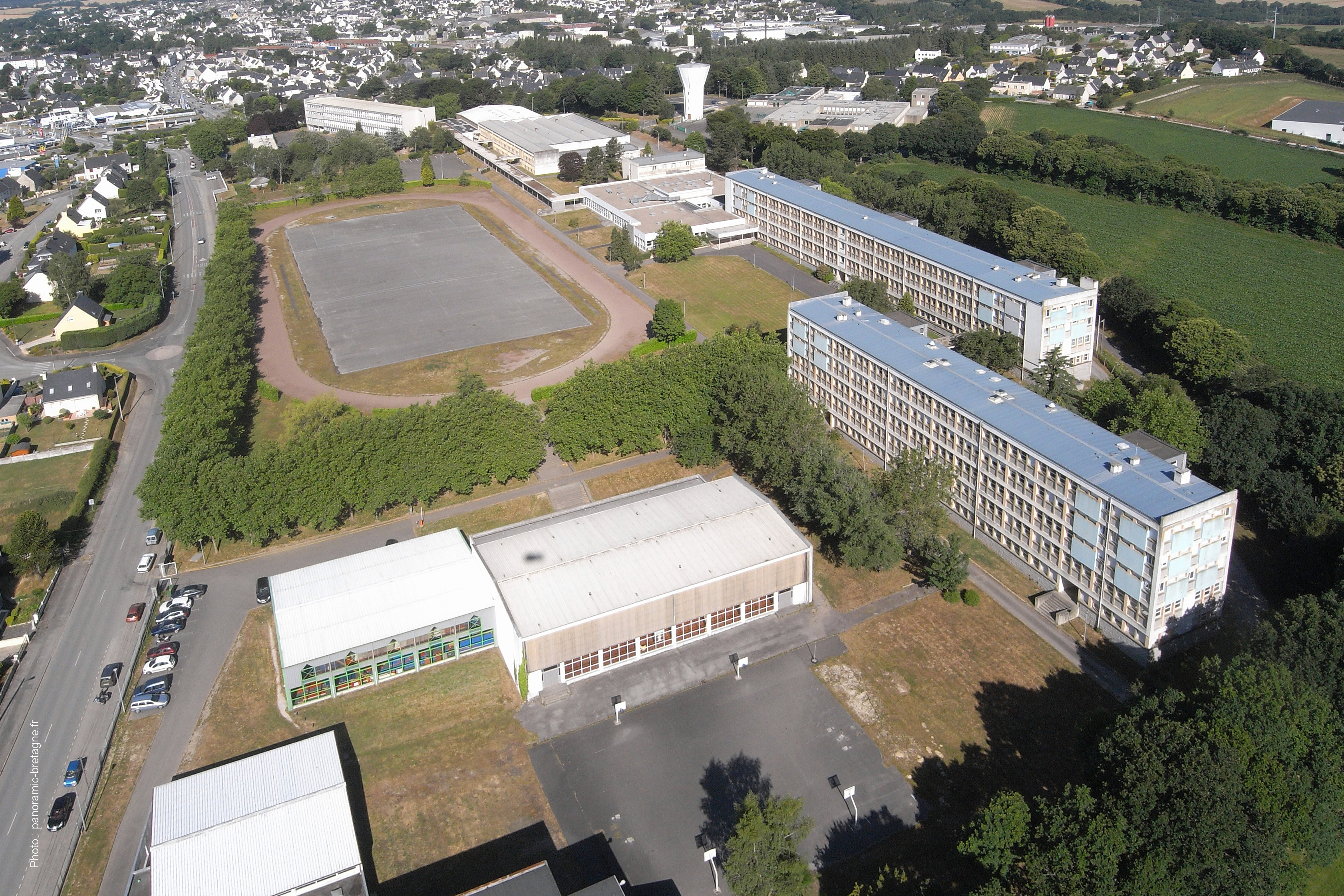 Vue aérienne prise de l'est. A l'ouest du lycée se déploie la ville de Carhaix-Plouguer. Au premier plan, noter l'extension du gymnase.Immatriculation