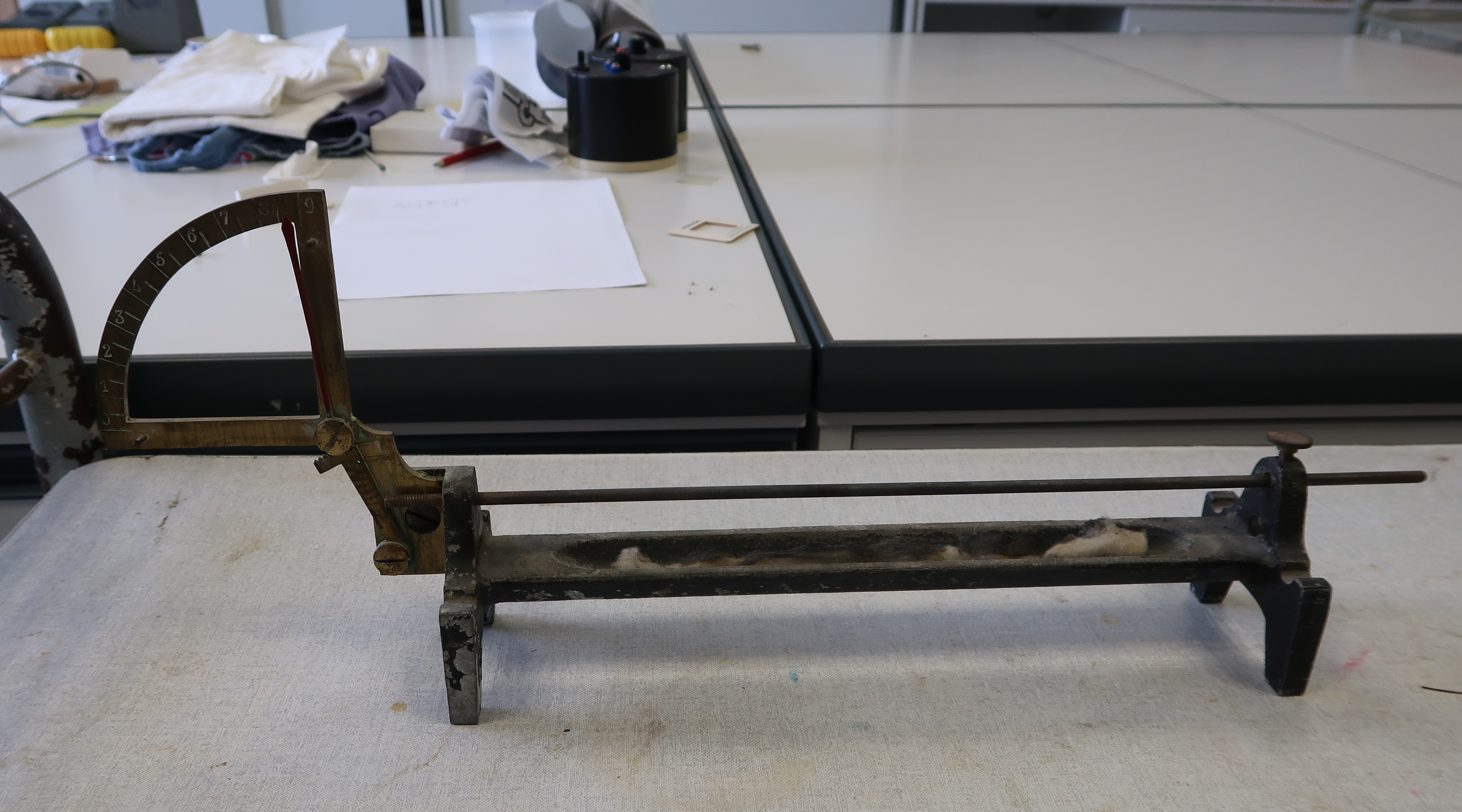 Collections pédagogiques du lycée : pyromètre à cadran (ou à levier) appelé aussi dilatomètre. Il est utilisé pour rendre visible le phénomène de dilatation linéaire des métaux.Immatriculation