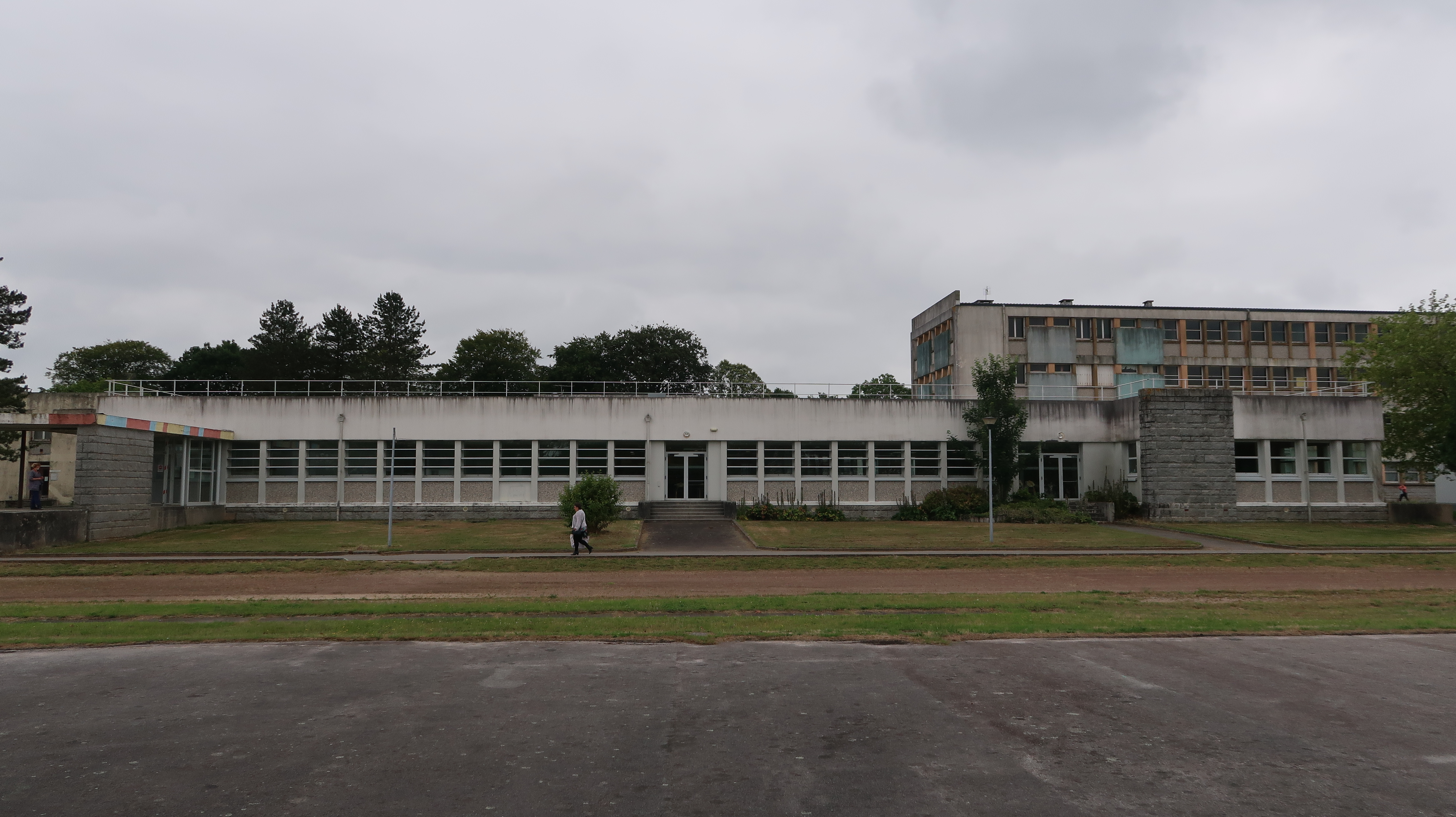 Façade sud de la restauration scolaire, vue d'ensemble. A droite, vue partielle de la façade sud de l'internat de garçons. Péron et Weisbein, architectes, 1967-1968.Immatriculation