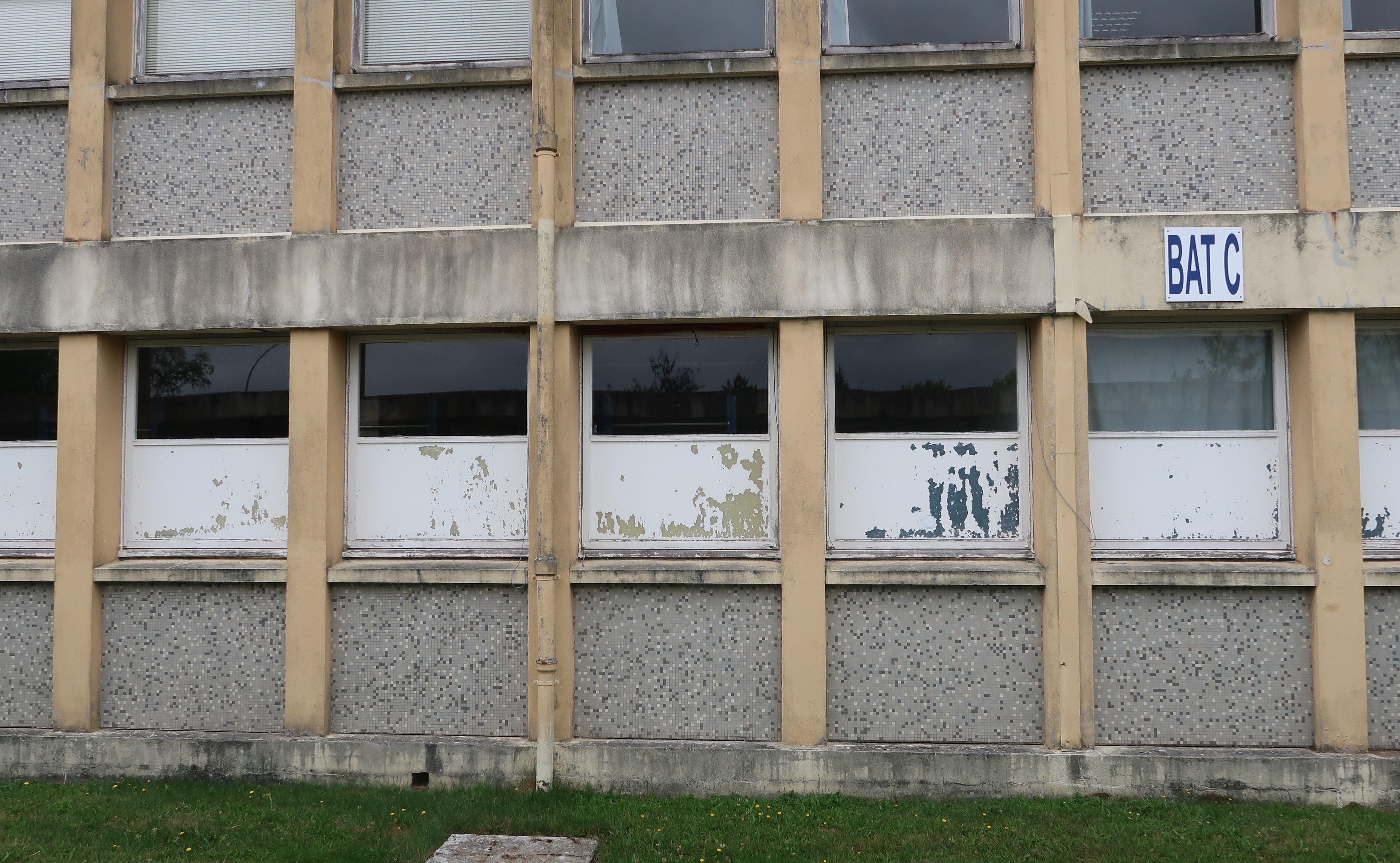 Détail de la trame du bâtiment des classes, en façade des ateliers : poteaux et poutres en béton armée, en saillie. Fenêtres basculantes à armature bois. Allèges en panneaux préfabriqués de béton recouverts de carreaux de grès. Péron et Weisbein, architectes, 1967-1968.Immatriculation