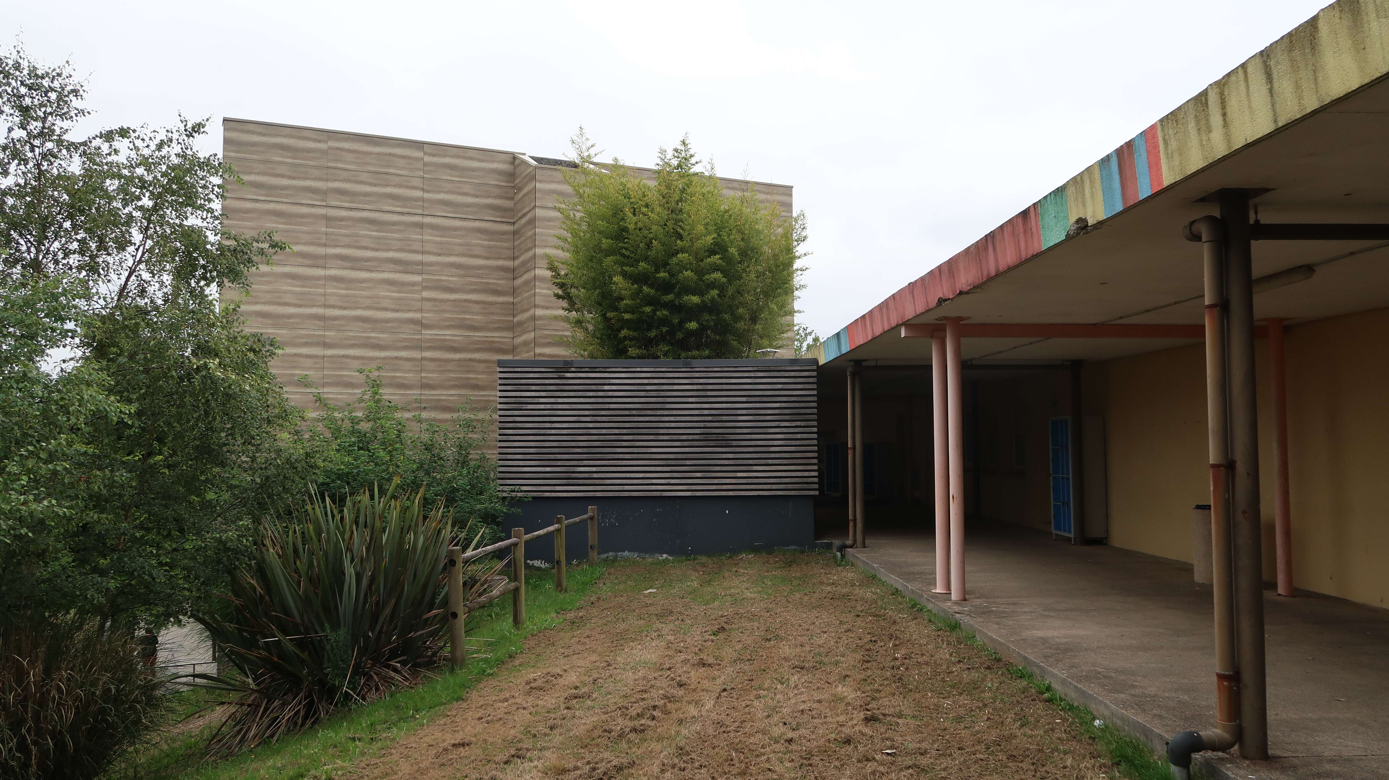 Pignon est de l'externat, suite à sa rénovation (isolation par l'extérieur).Immatriculation