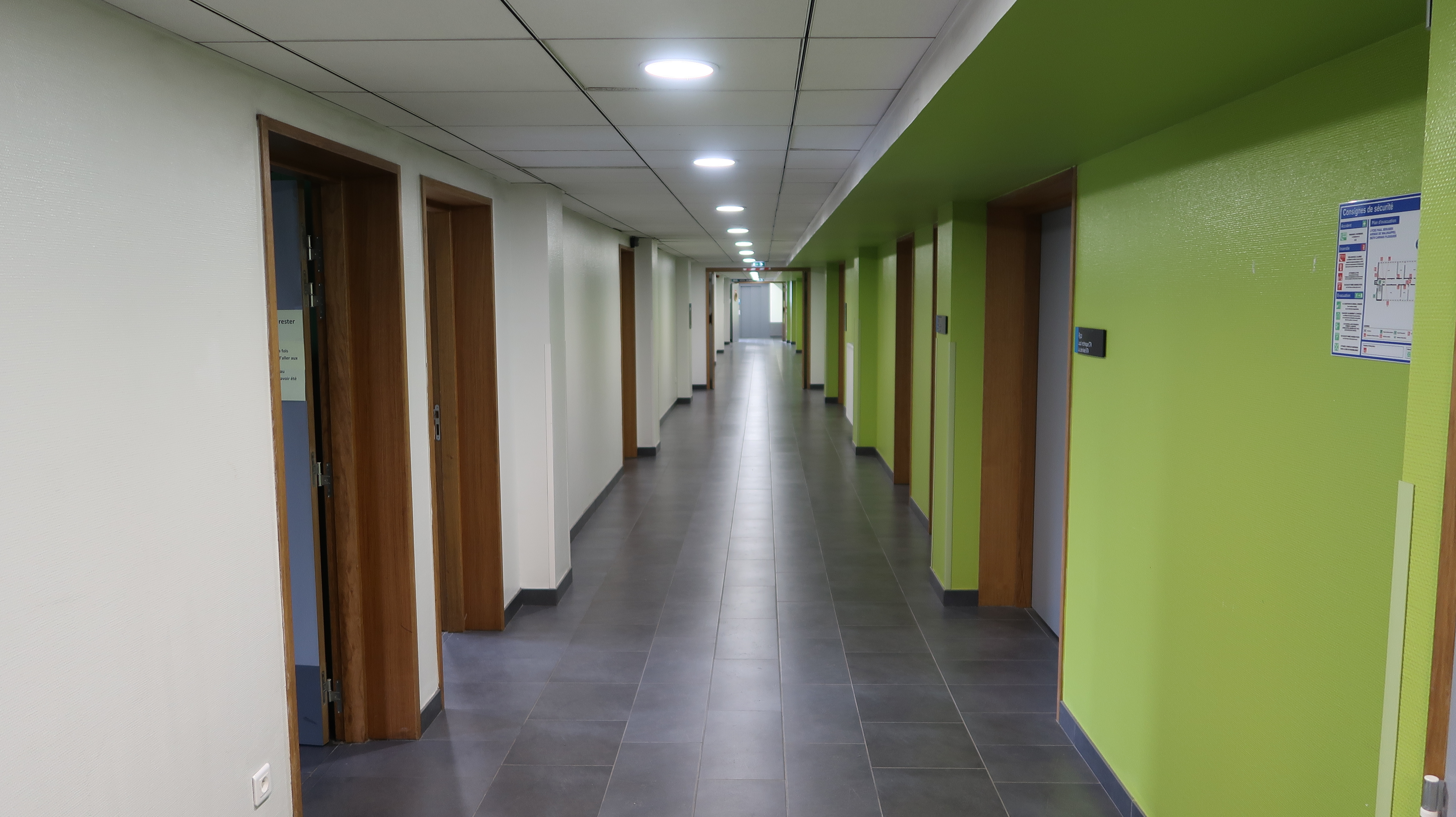 Dégagement central dans l'externat, suite à une restauration (huisseries des portes des salles de classe).Immatriculation
