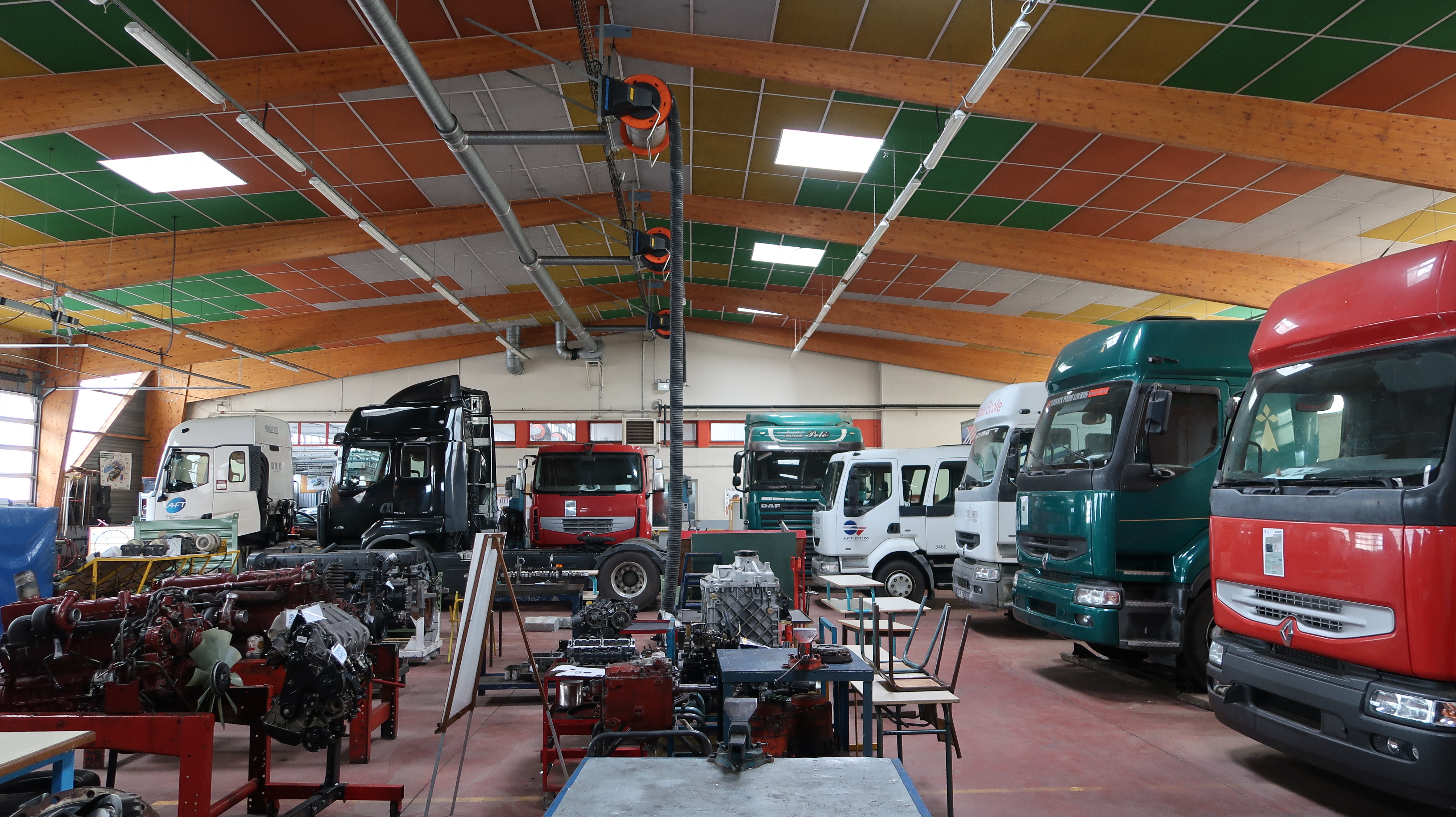 Vue intérieure de l'atelier mécanique camion. Il est implanté dans une extension des ateliers d'origine. Noter la structure porteuse en bois lamellé-collé.Immatriculation