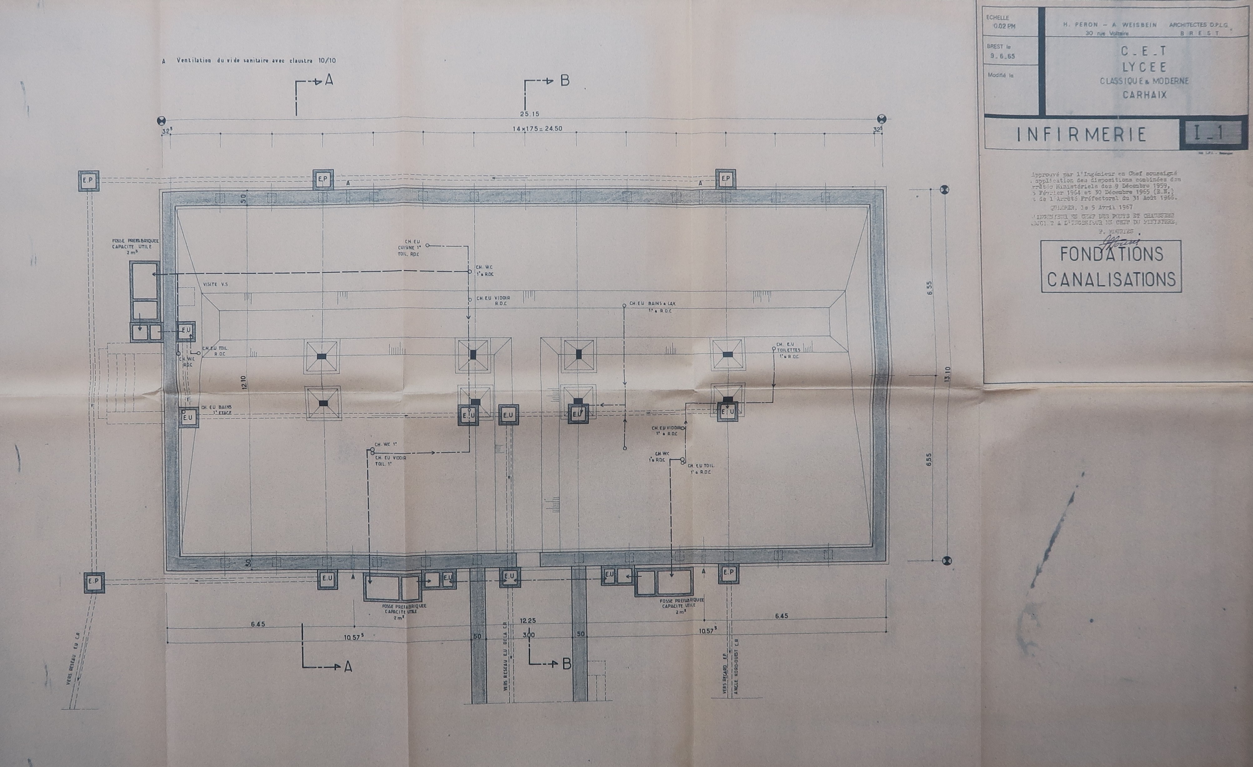 Plan des fondations et canalisations, H. Péron et A. Weisbein, architectes, 9/6/1965.Immatriculation