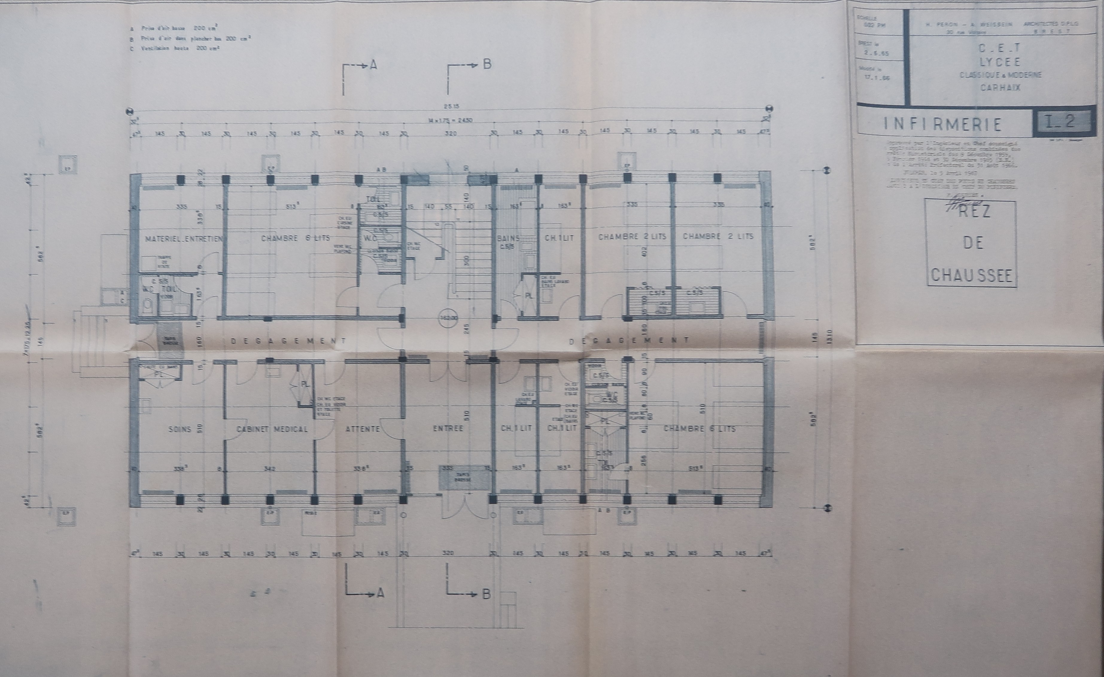 Archives départementales du Finistère : 107W39. Péron [H.] et Weisbein [A.], Ensemble de plans et élévations du CET et lycée classique et moderne de Carhaix, 1965 - 1966