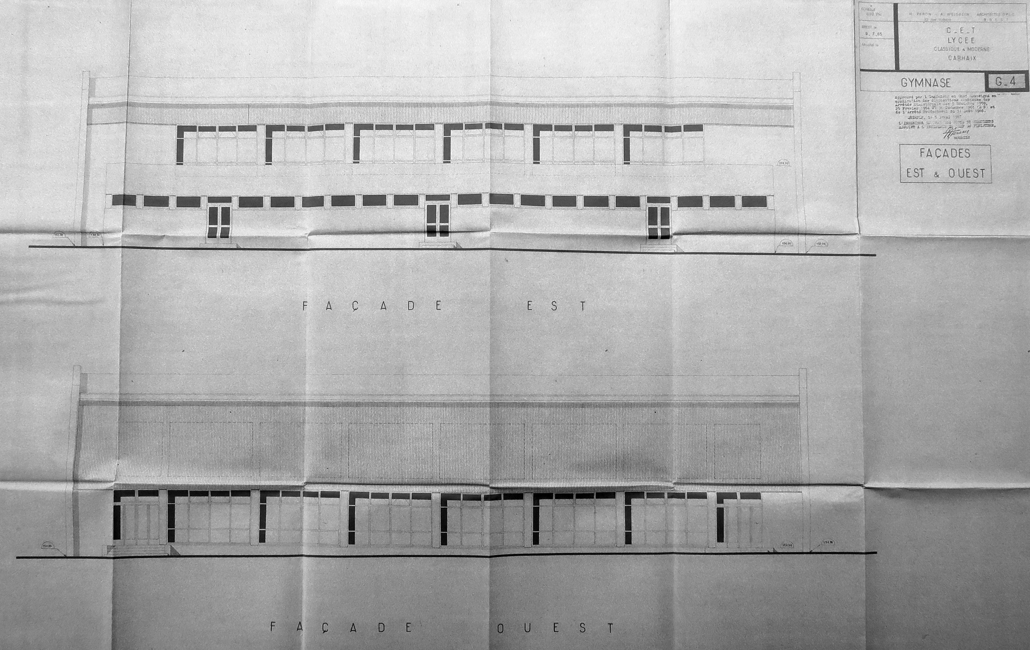 Élévations des façades est et ouest. H. Péron et A. Weisbein, architectes, 22/07/1965.Immatriculation