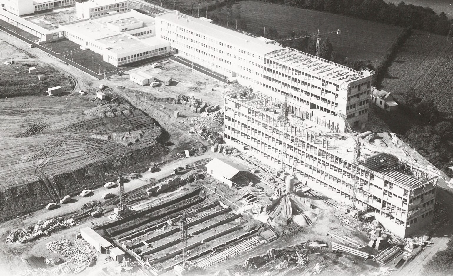 Détail d'une vue aérienne (Heurtier, photographe), prise du sud-est, le 9 octobre 1967. Au premier plan, la construction, celle du gymnase a débuté. Péron et Weisbein, architectes, 1967.Immatriculation