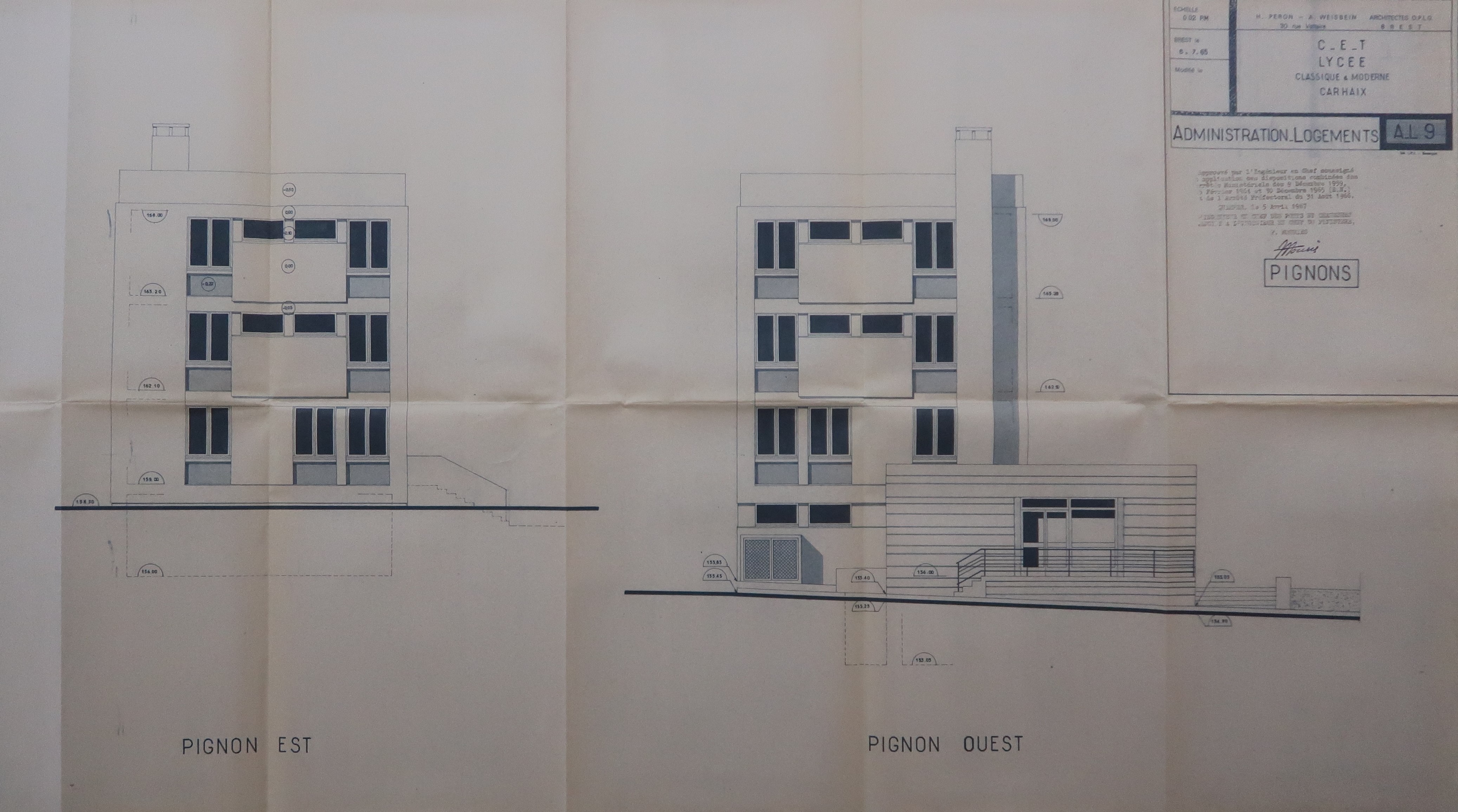 Archives départementales du Finistère : 107W39. Péron [H.] et Weisbein [A.], CET - lycée classique et moderne de Carhaix. Plans de l'administration - logement et du service de restauration, 1965