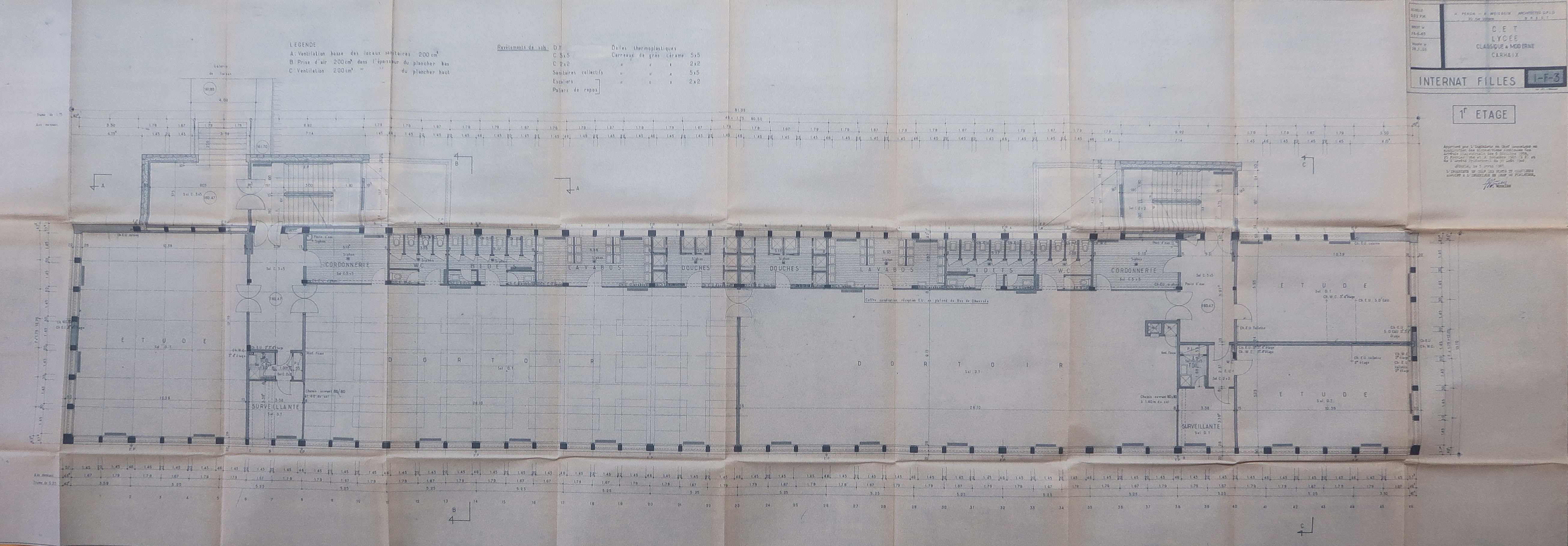 Plan du 1er étage de l'internat de filles. Hervé Péron et Alexandre Weisbein, architectes, 1965.Immatriculation