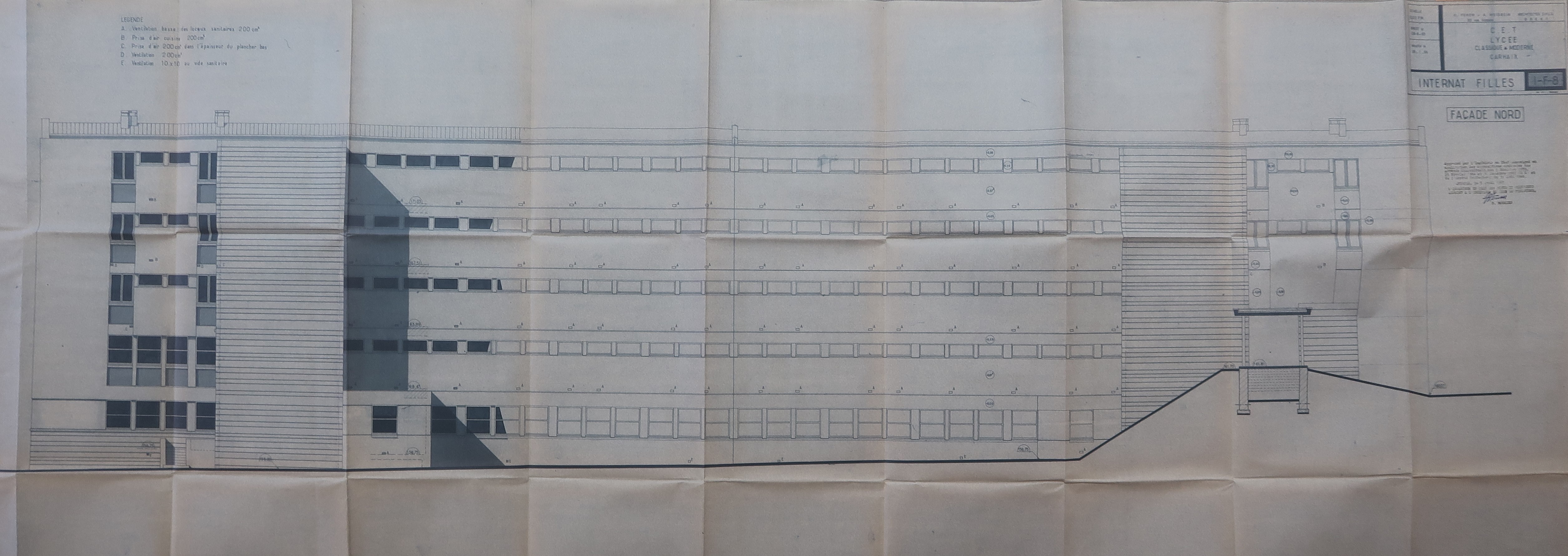 Elévation de la façade nord de l'internat de filles. Hervé Péron et Alexandre Weisbein, architectes, 1965.Immatriculation