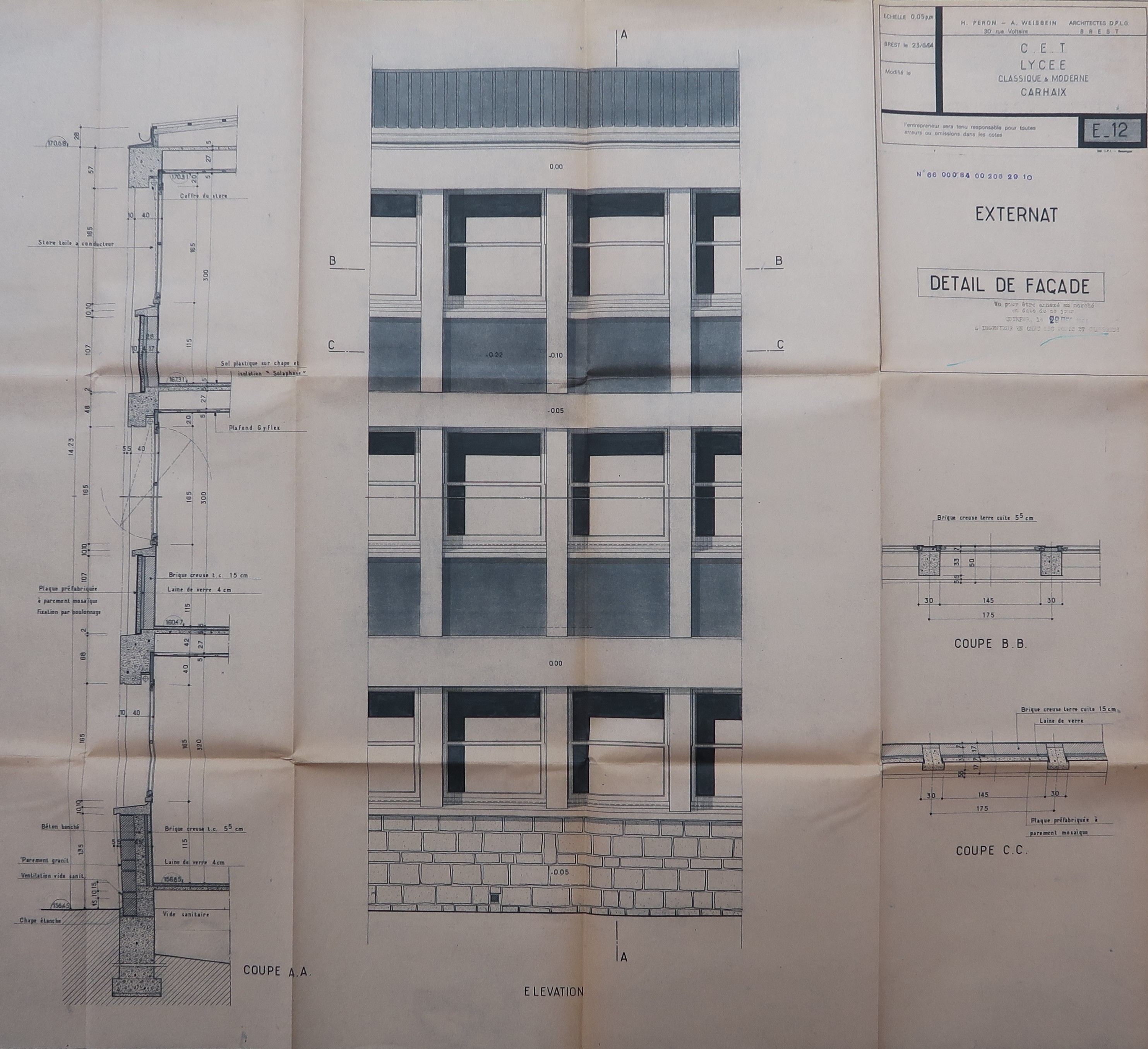 Archives départementales du Finistère : 107W51. Péron [h.] et Weisbein [A.], CET-Lycée classique et moderne-Carhaix. Plans du gymnase, de l'externat et des ateliers, 1964.