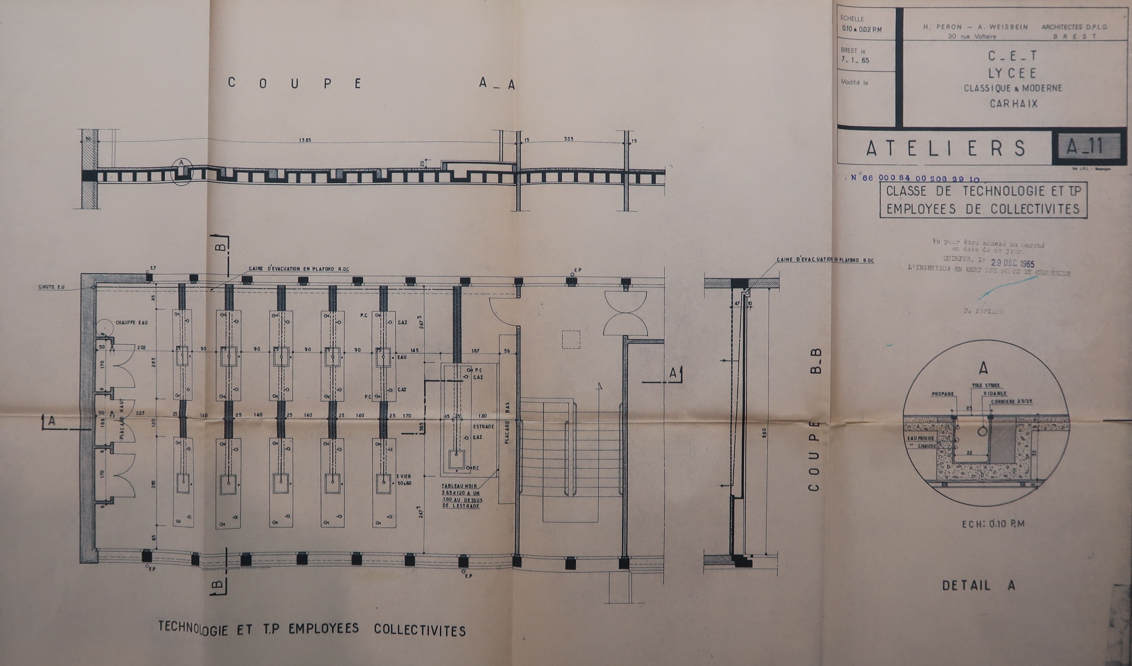 Ateliers, plan d'une "classe de technologie employées de collectivités" . Hervé Péron et Alexandre Weisbein, architectes, 1964. Noter l'usage du féminin. Le lycée est mixte mais les formations encore très genrées.Immatriculation