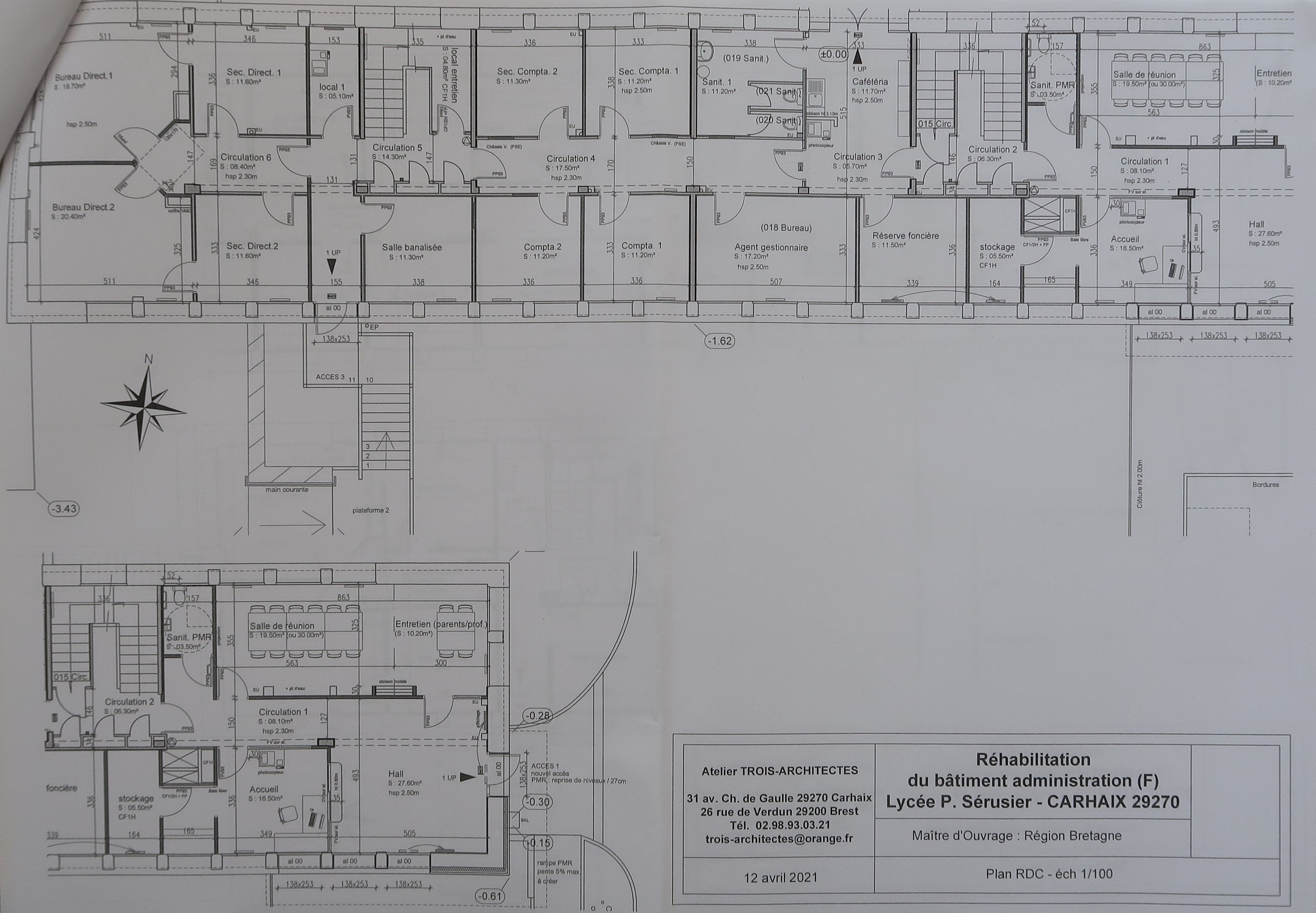 Plan du rez-de-chaussée du bâtiment d'accueil, administration et logements lors de sa restructuration. A3A architectes, 2021. La création d'un hall d'accueil est à relier au changement d'emplacement de l'entrée.Immatriculation