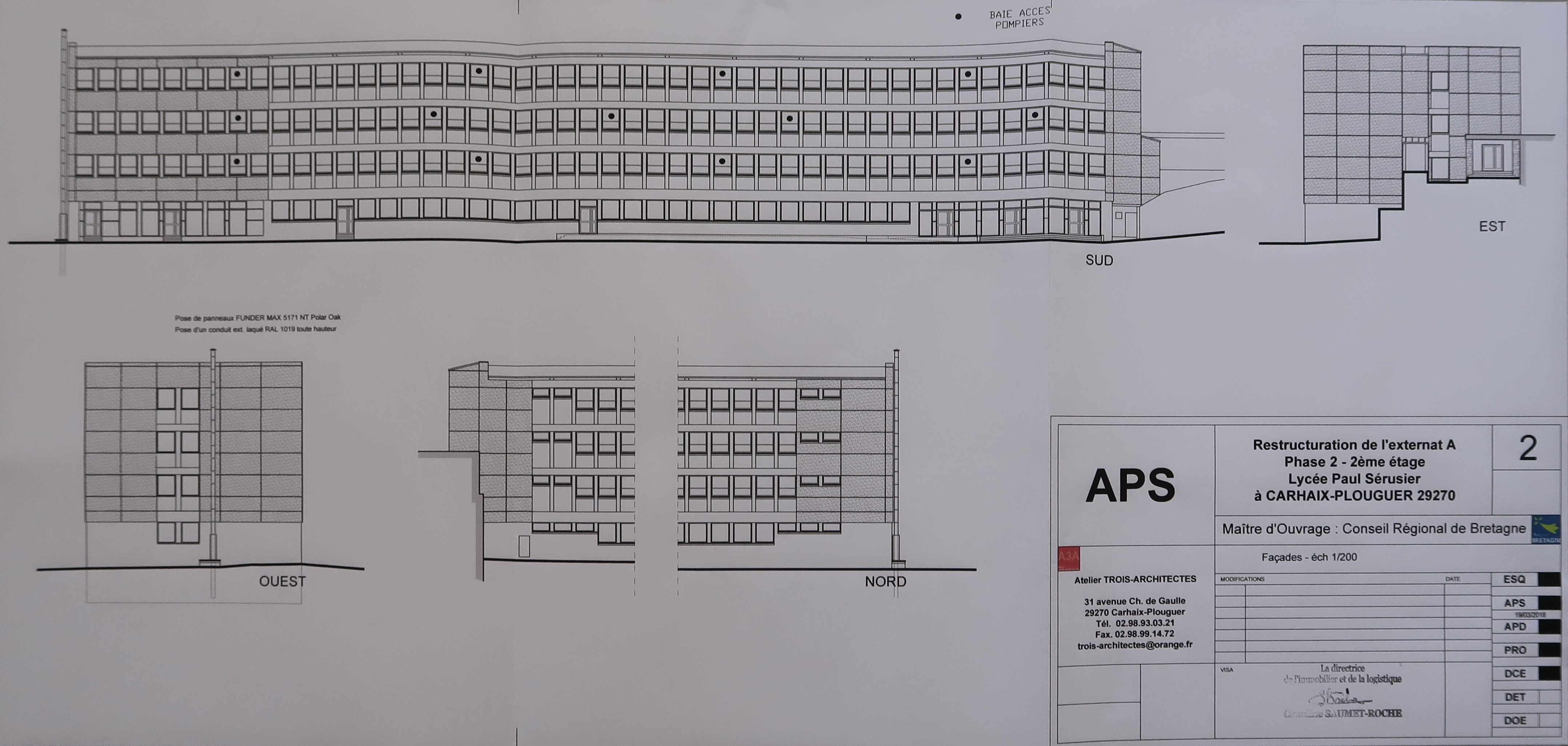 Elévations des façades lors de la restructuration de l'externat, 2e phase. A3A architectes, vers 2018. Noter le bardage partiel des façades, en remplacement d'un bardage existant mais postérieur à la construction du lycée.Immatriculation