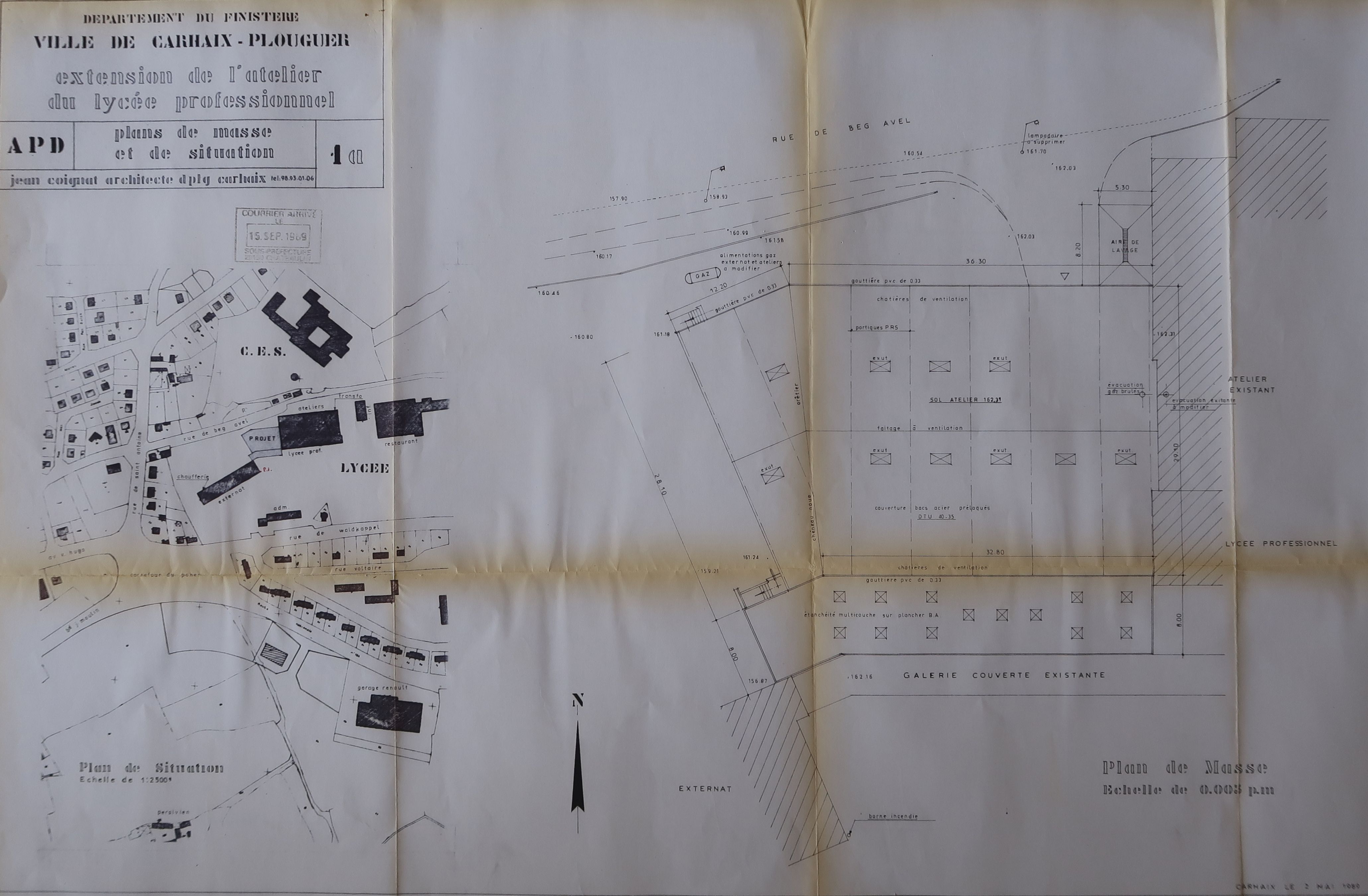 Extension des ateliers du lycée professionnel, plan de masse et de situation (Jean Coignat, architecte, 1989).Immatriculation