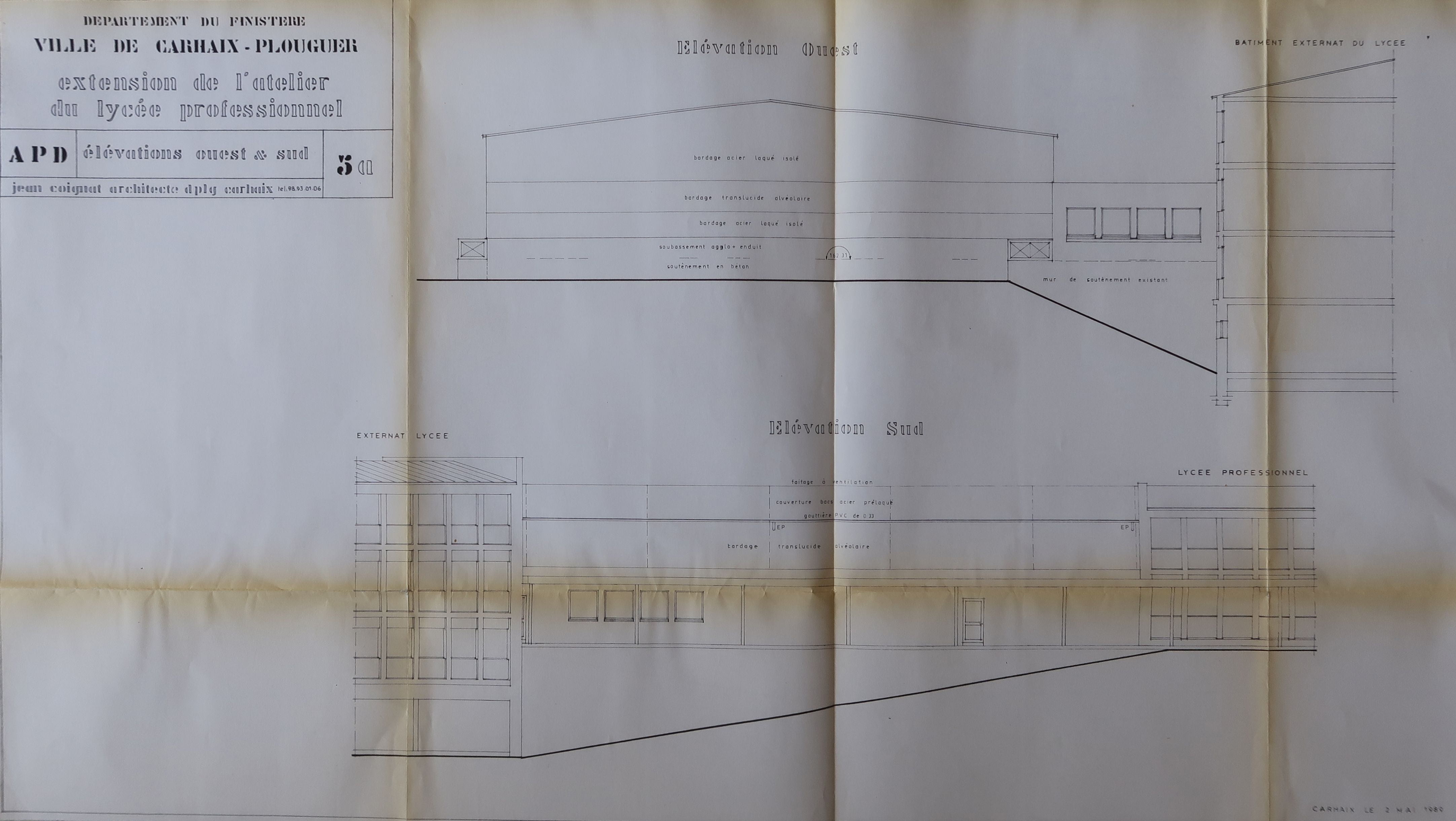 Extension des ateliers du lycée professionnel, élévations ouest et sud (Jean Coignat, architecte, 1989).Immatriculation