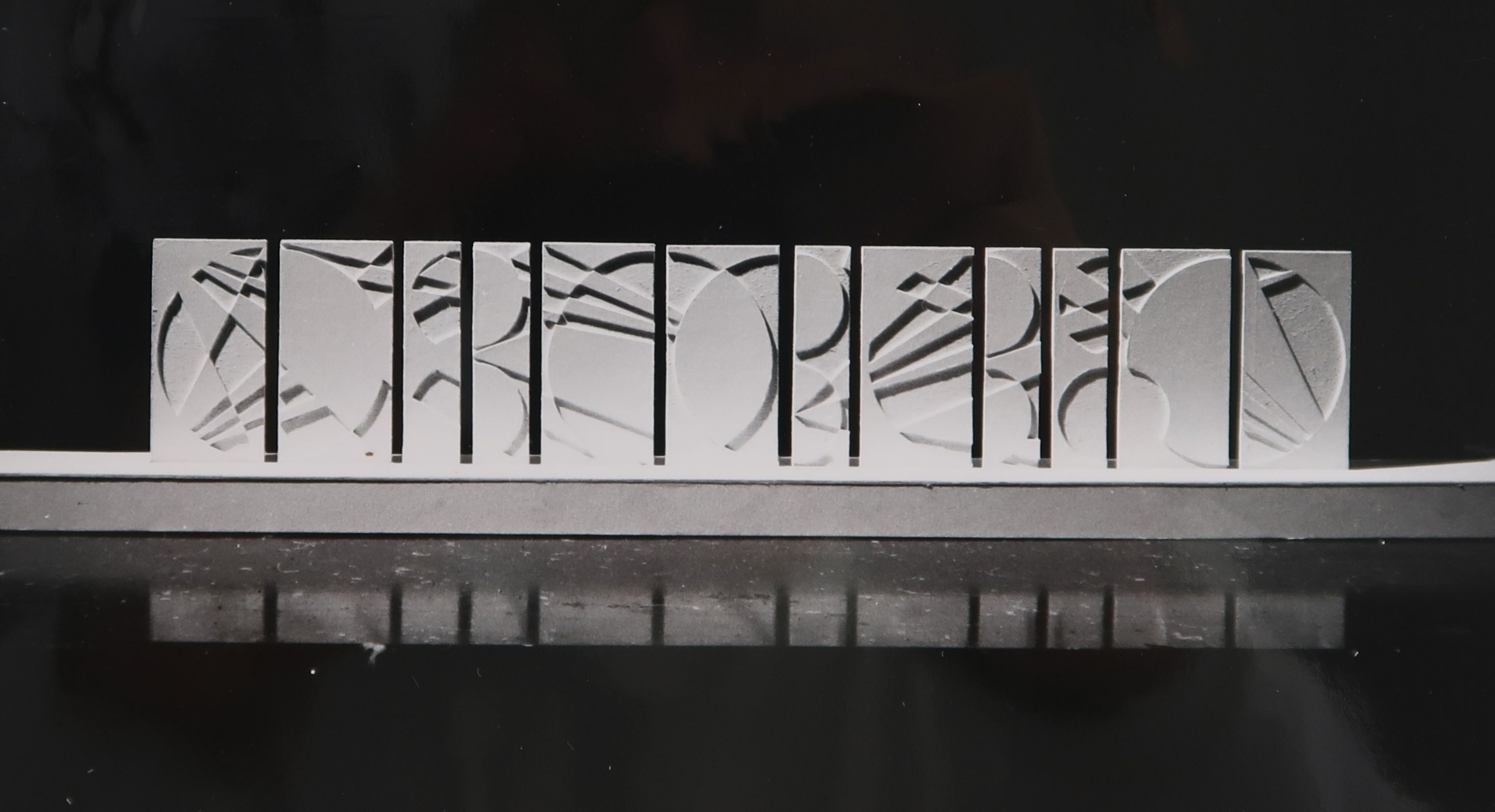 Roger Joncourt, maquette pour un mur sculpté de 1,80 m x 9,70 m, acceptée par la commission le 10 mars 1970. Œuvre disparue.Immatriculation
