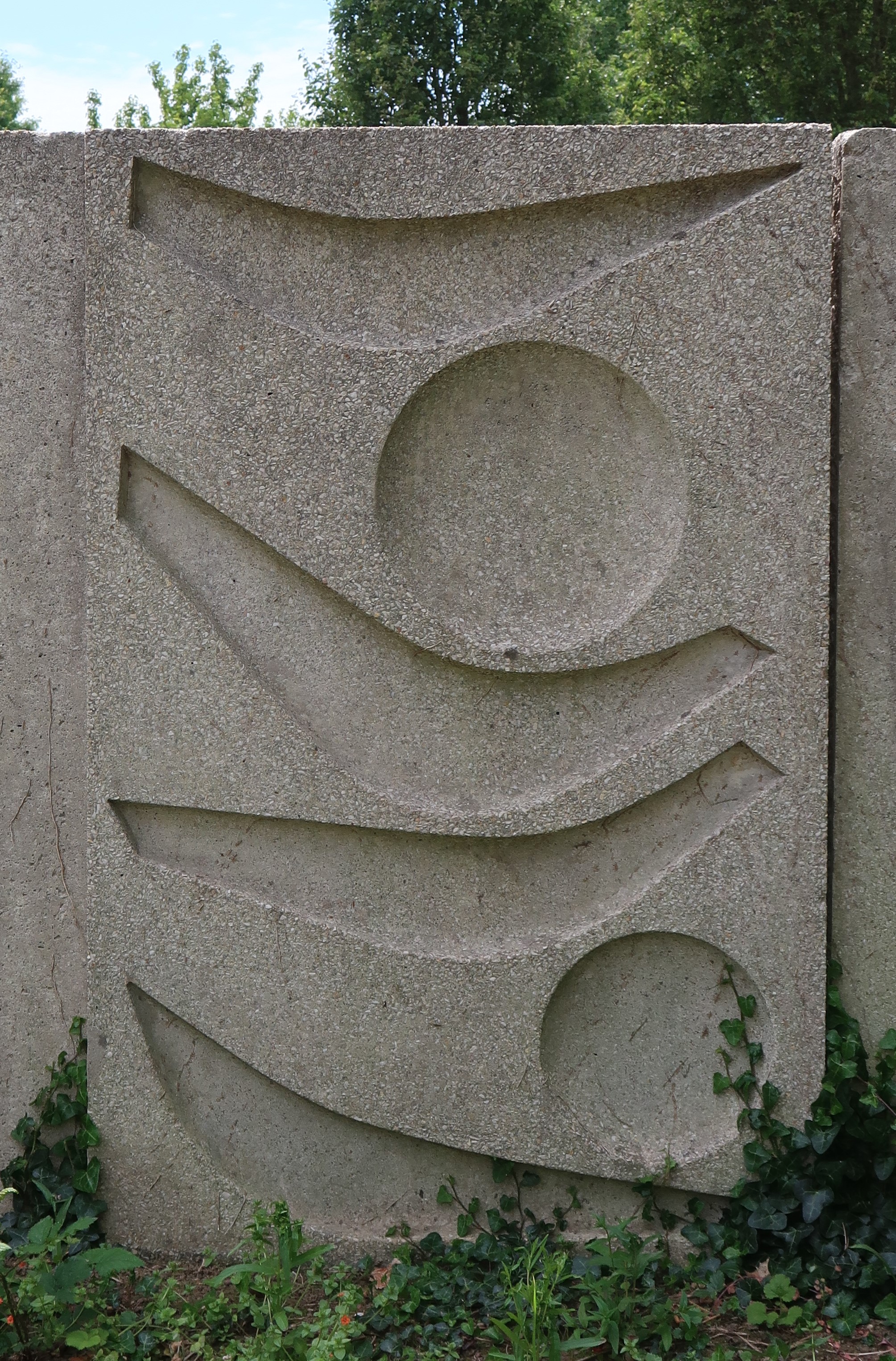 Détail du mur sculpté continu (Edgard Pillet, 1970).Immatriculation