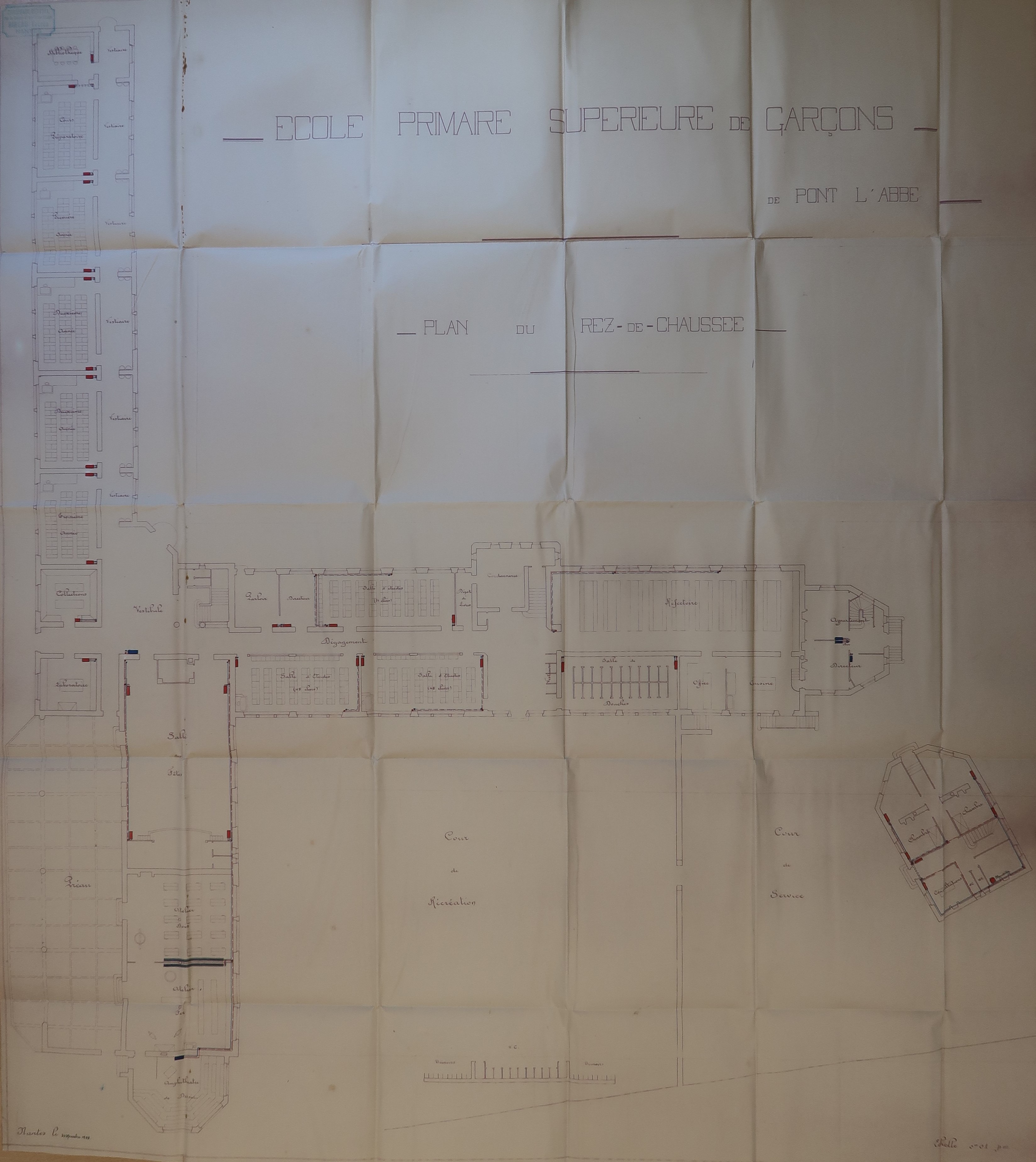 Archives départementales des Côtes-d'Armor : 124J186. Lefort [G-R.], Jeu de plans et dessins de l'école primaire supérieure de Pont-l'Abbé, 1925-1928.