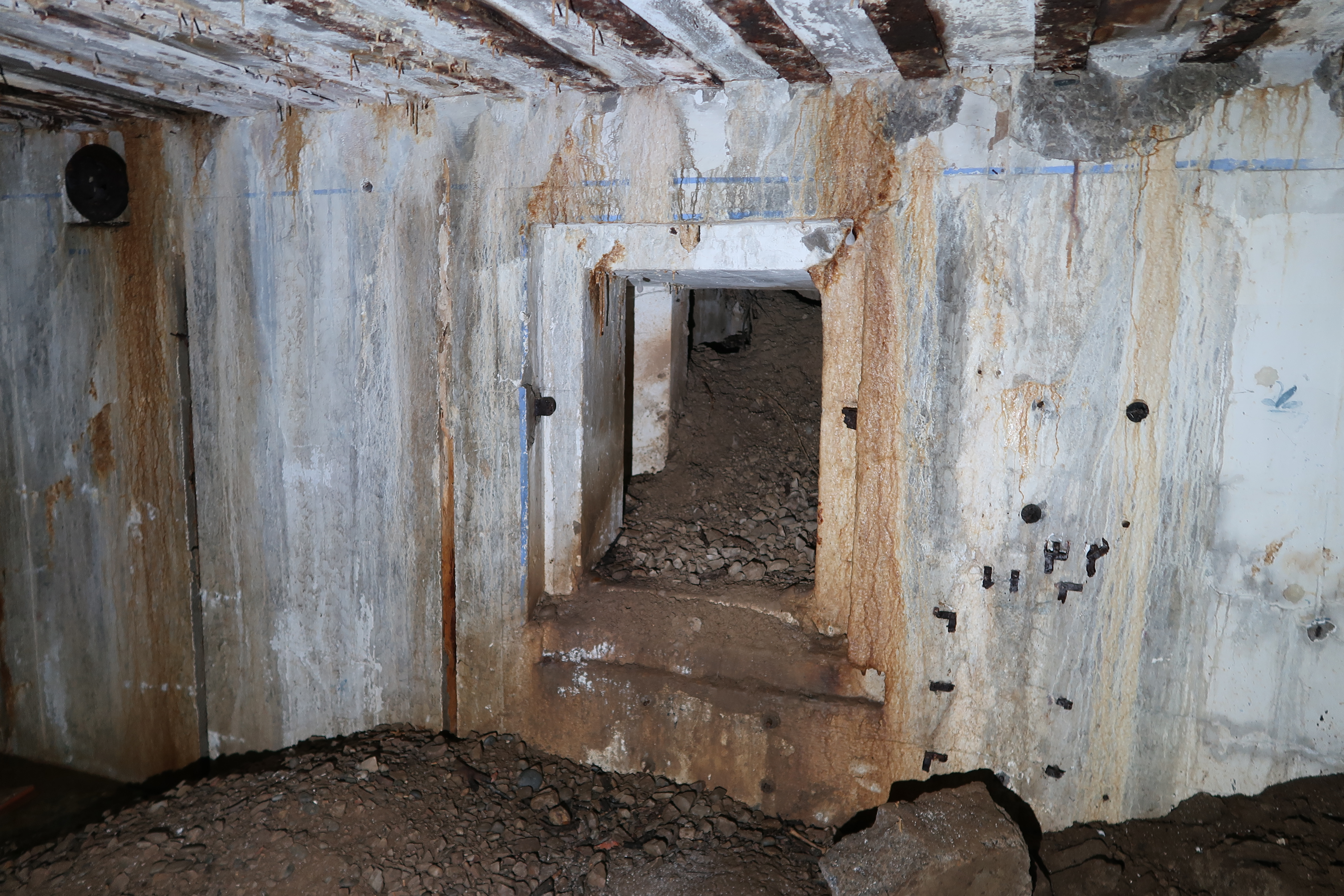 Vue intérieure du bunker - abri pour 6 soldats de type VF 1a de Menguen (dans le champ), à l'ouest de l'actuelle rue de Kerléo : sortie de secours de la pièce de vue - chambre de troupe (état en 2021). Sur le mur, liseré de couleur bleue faisant frise et fleur (à droite)Immatriculation