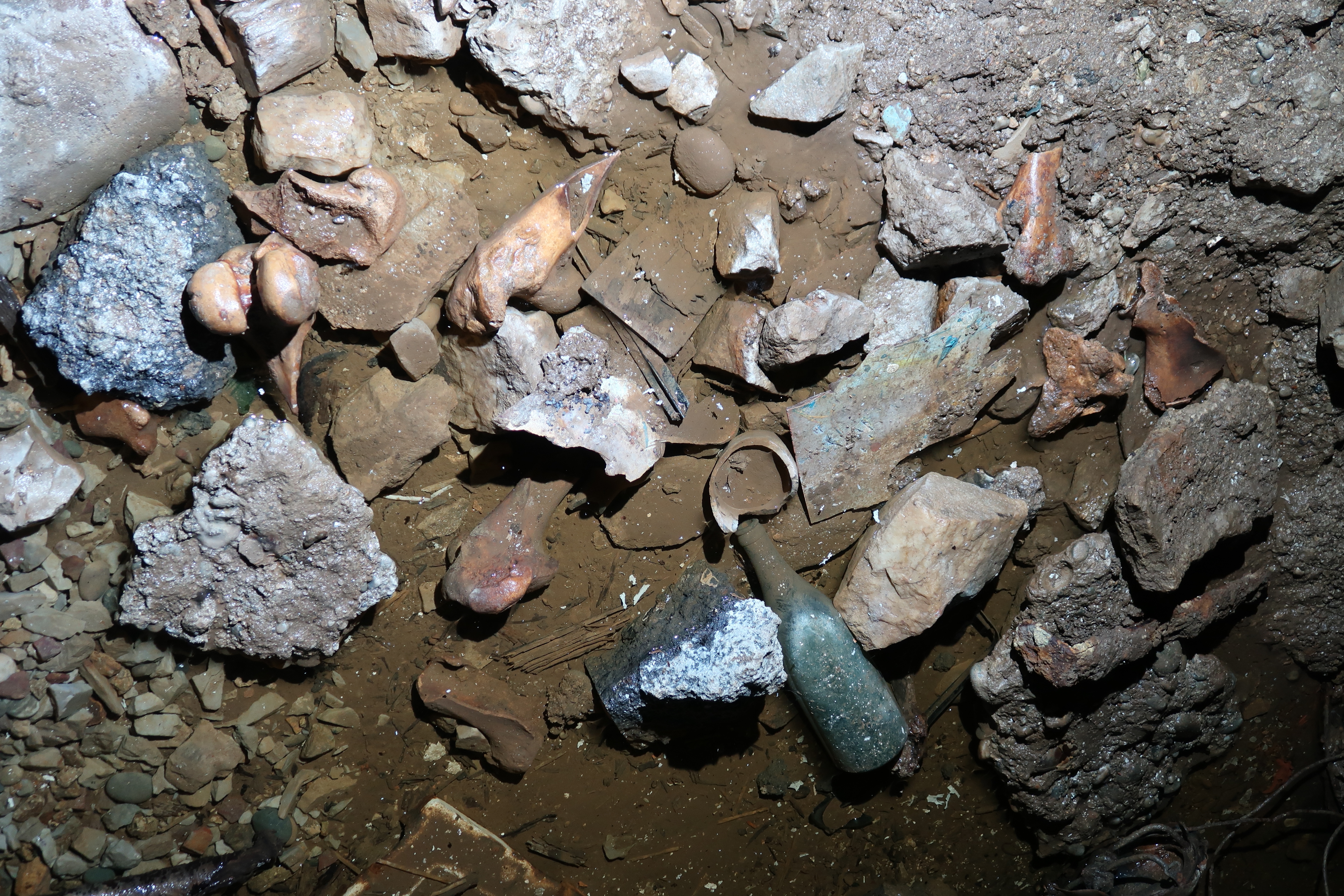 Vue du sol : éclats de béton, galets, bouteille de bière et morceaux de céramique... (état en 2021)Immatriculation