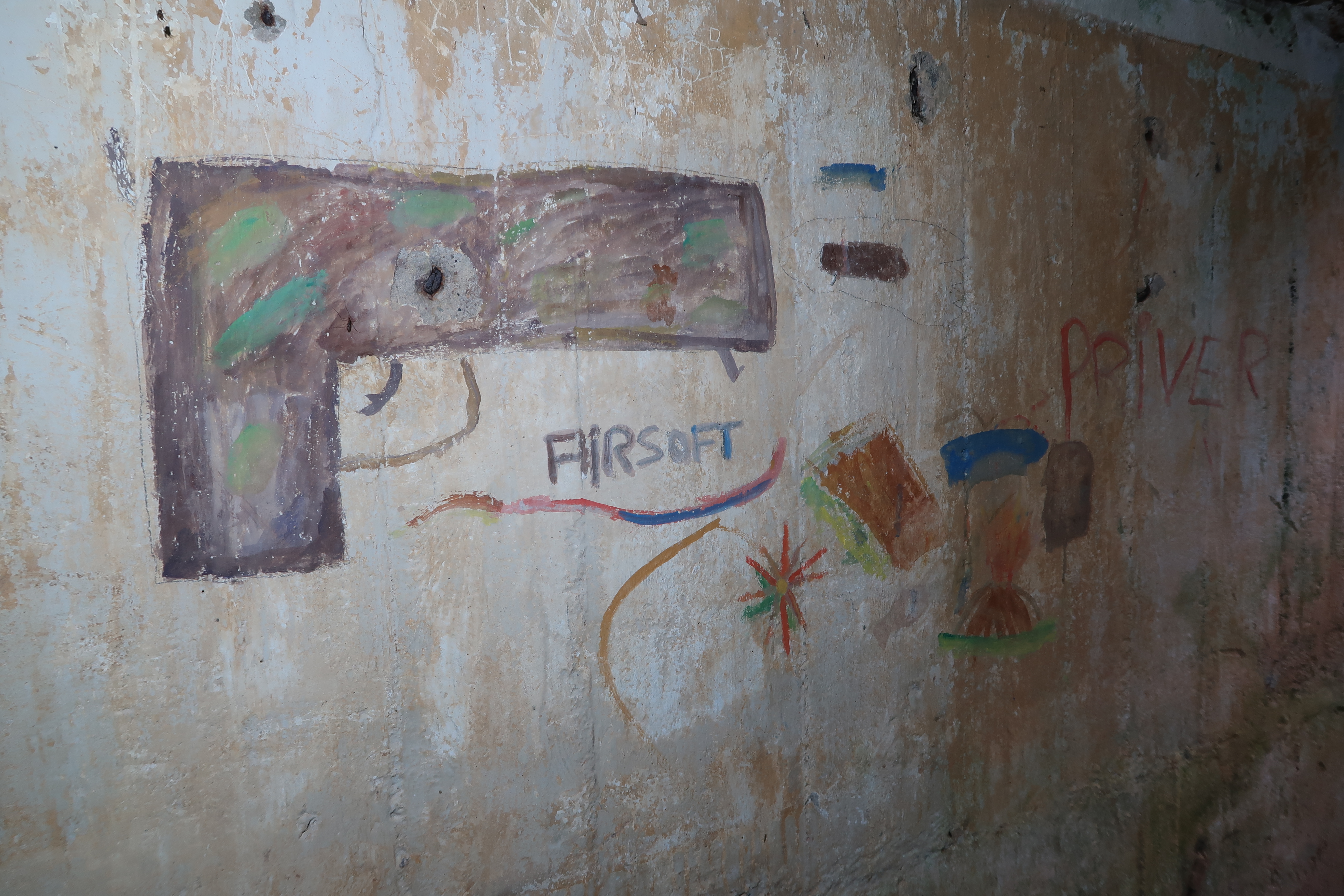 Vue du mur de refend situé entre le couloir d'accès et la pièce de vie - chambre de troupe : peinture murale contemporaine représentant un pistolet et inscription "AIRSOFT" (état en 2021)Immatriculation