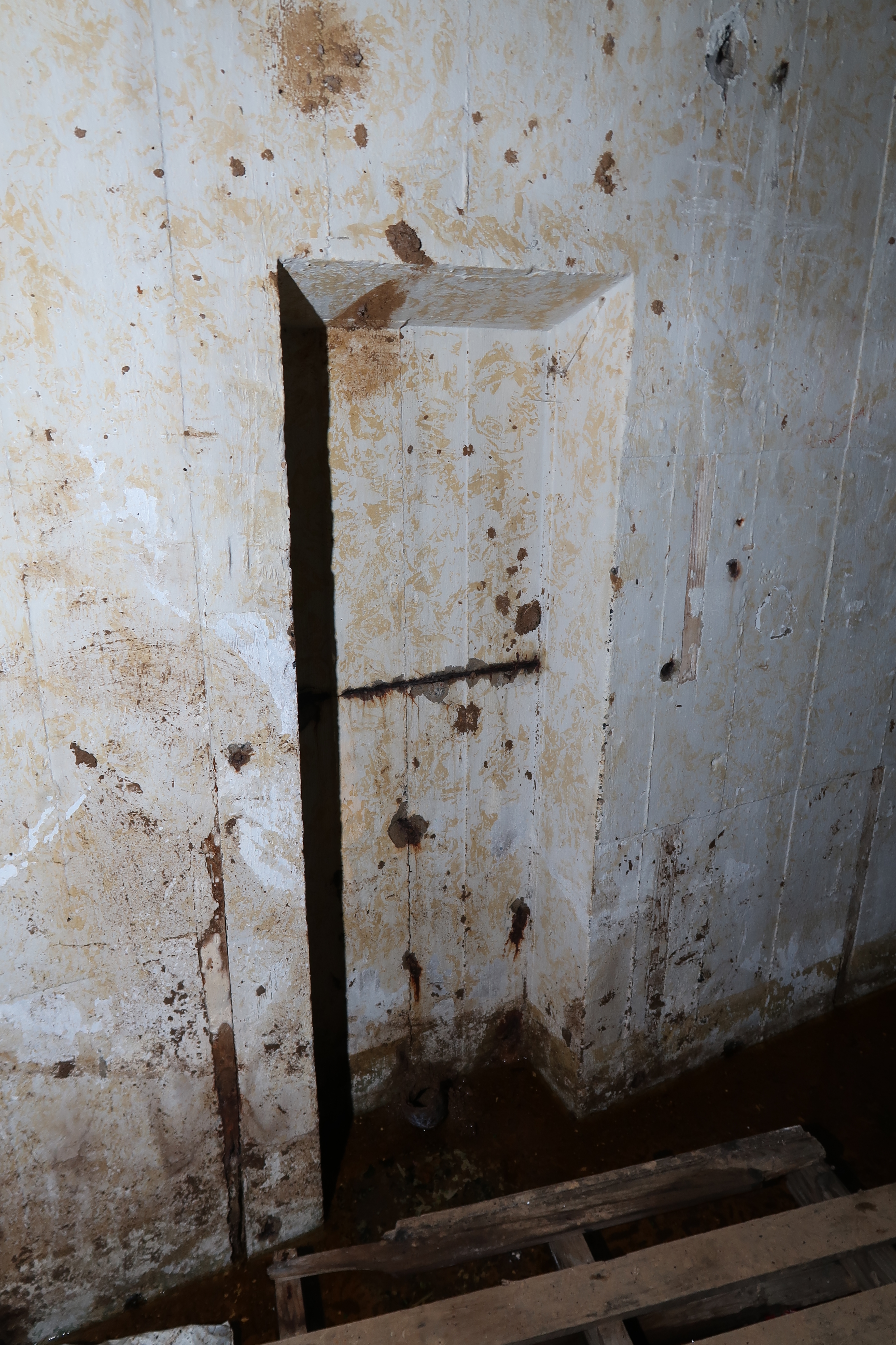 Vue de la pièce de vie - chambre de troupe : niche murale (état en 2021). Les murs du bunker ont conservé leur peinture murale tachetée ocre jaune d'origineImmatriculation