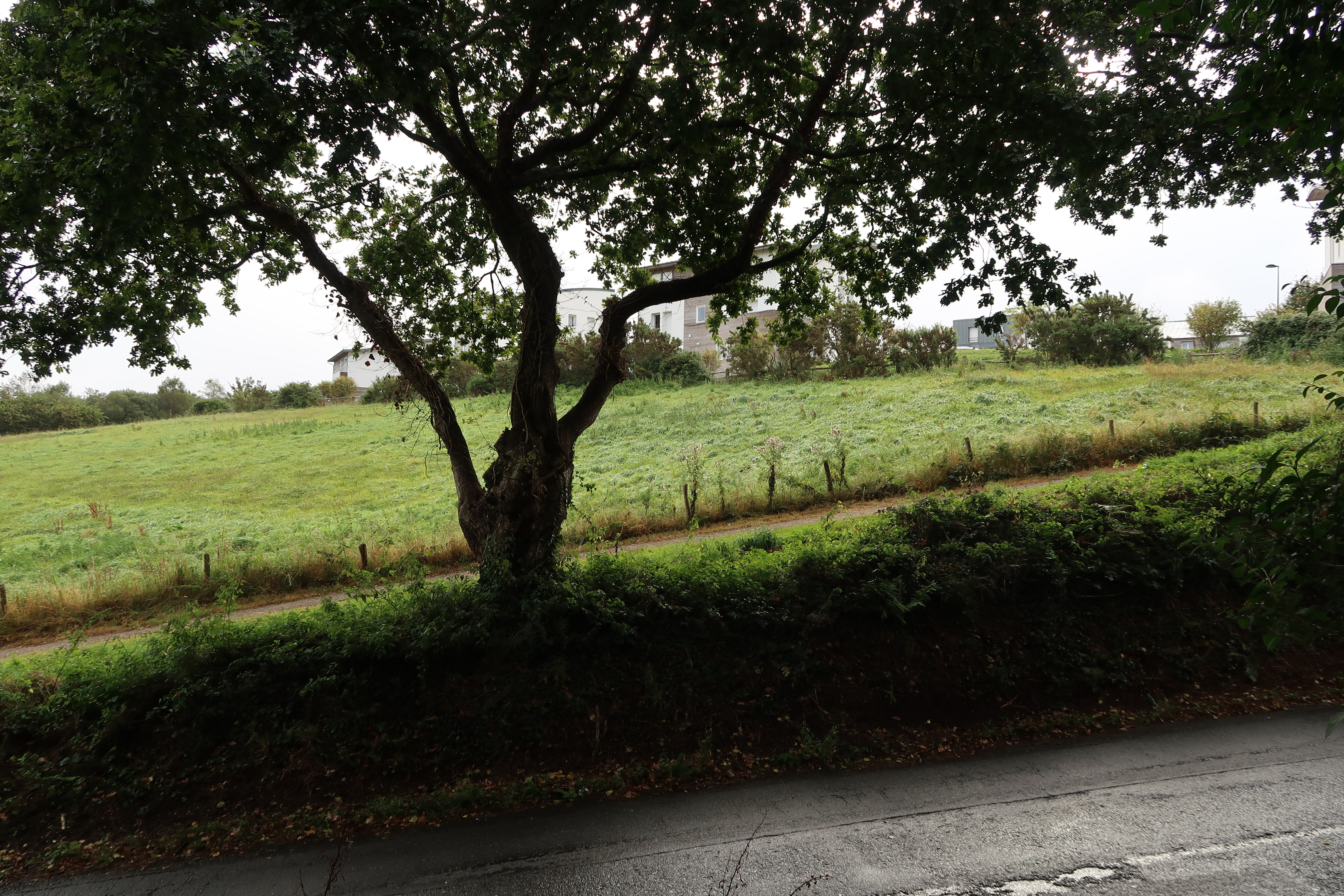 Vue de la route de Guilers (actuelle route de Kerléo) (état en 2021). Une casemate en béton armé, variante allégée du type 667 (365) abritant un canon de 5 cm se trouvait de l'autre côté de la route avant la construction de logementsImmatriculation