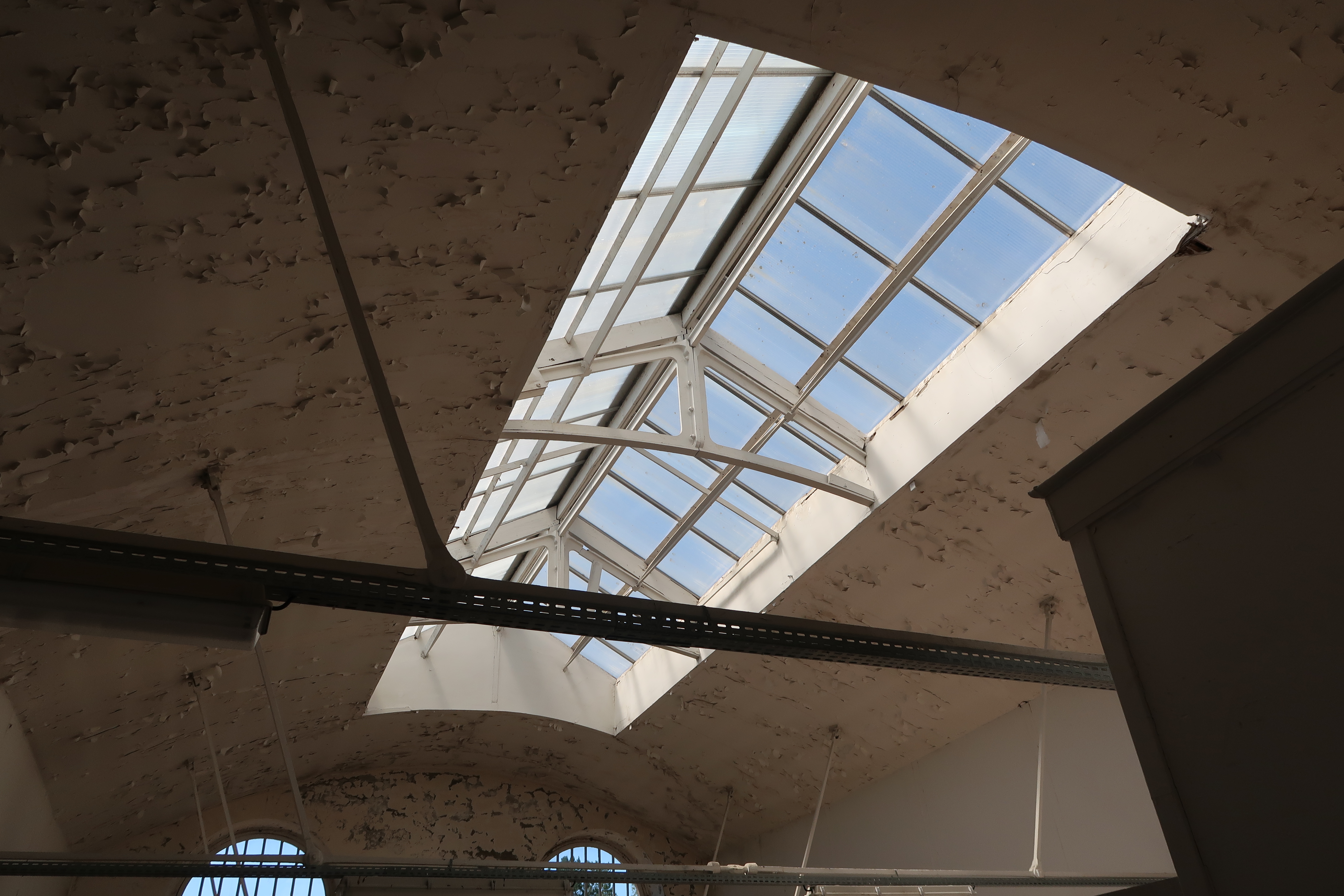 Vue intérieure : partie ouest, charpente métallique et lanterneau (état en 2022)Immatriculation
