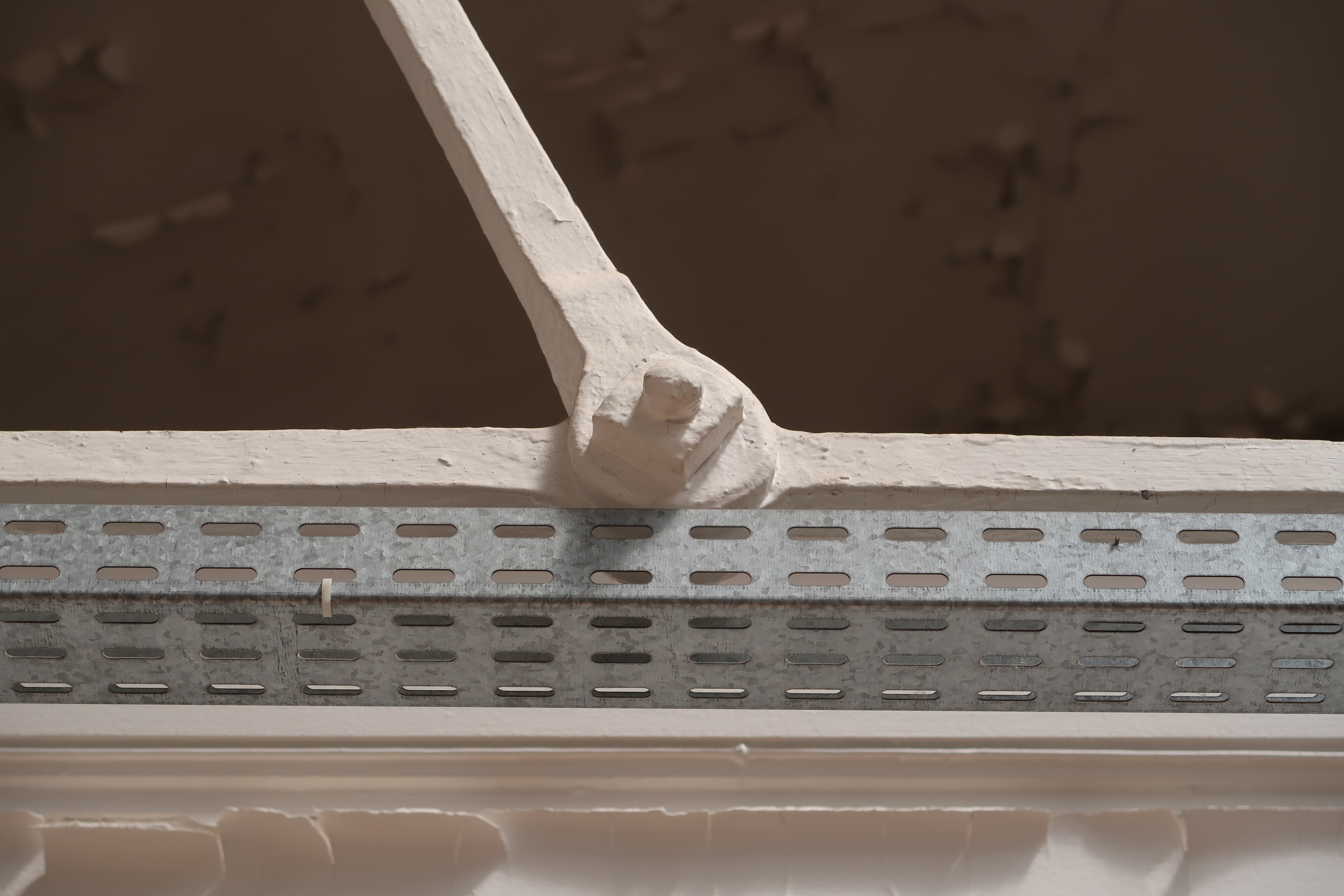 Vue intérieure : partie ouest, détail de l'un des tirants faisant "entrait" de la charpente métallique (état en 2022)Immatriculation