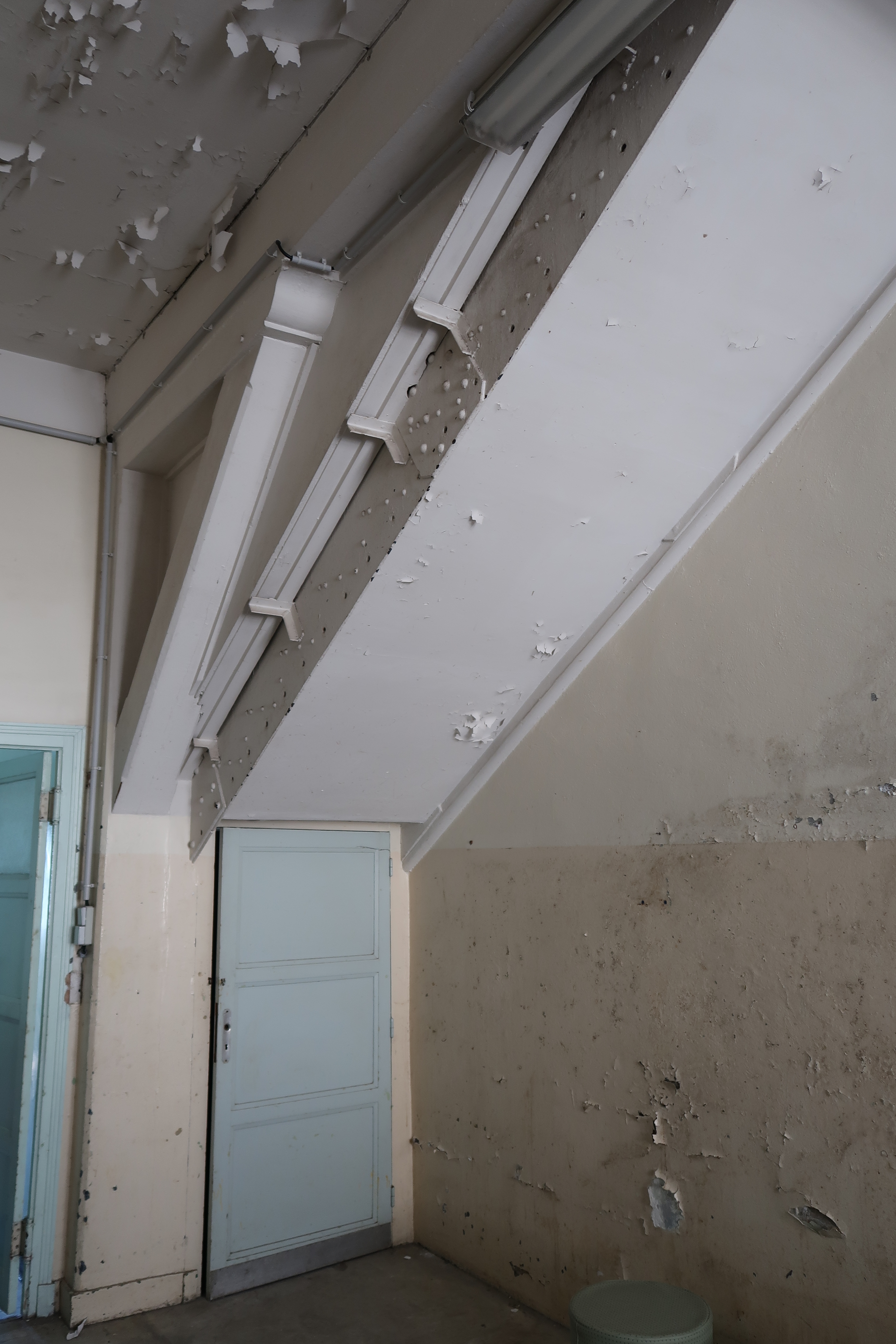 Vue intérieure : partie ouest, escalier en charpente métallique desservant le premier étage (état en 2022)Immatriculation