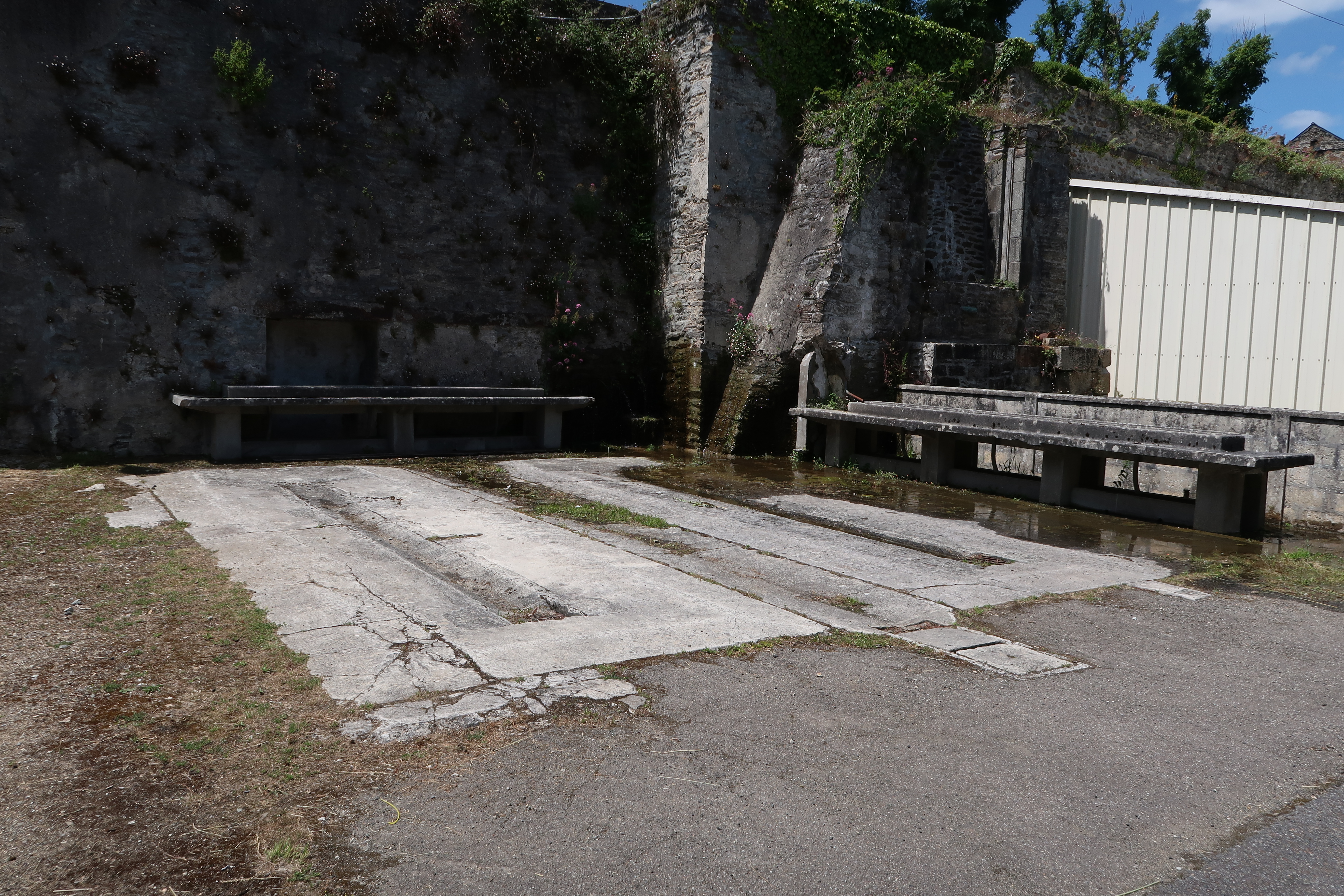 Vue de l'emplacement de l'un des bâtiments industriels (état en 2022). Disposés en angle droit, deux lavabos collectifs en béton arméImmatriculation