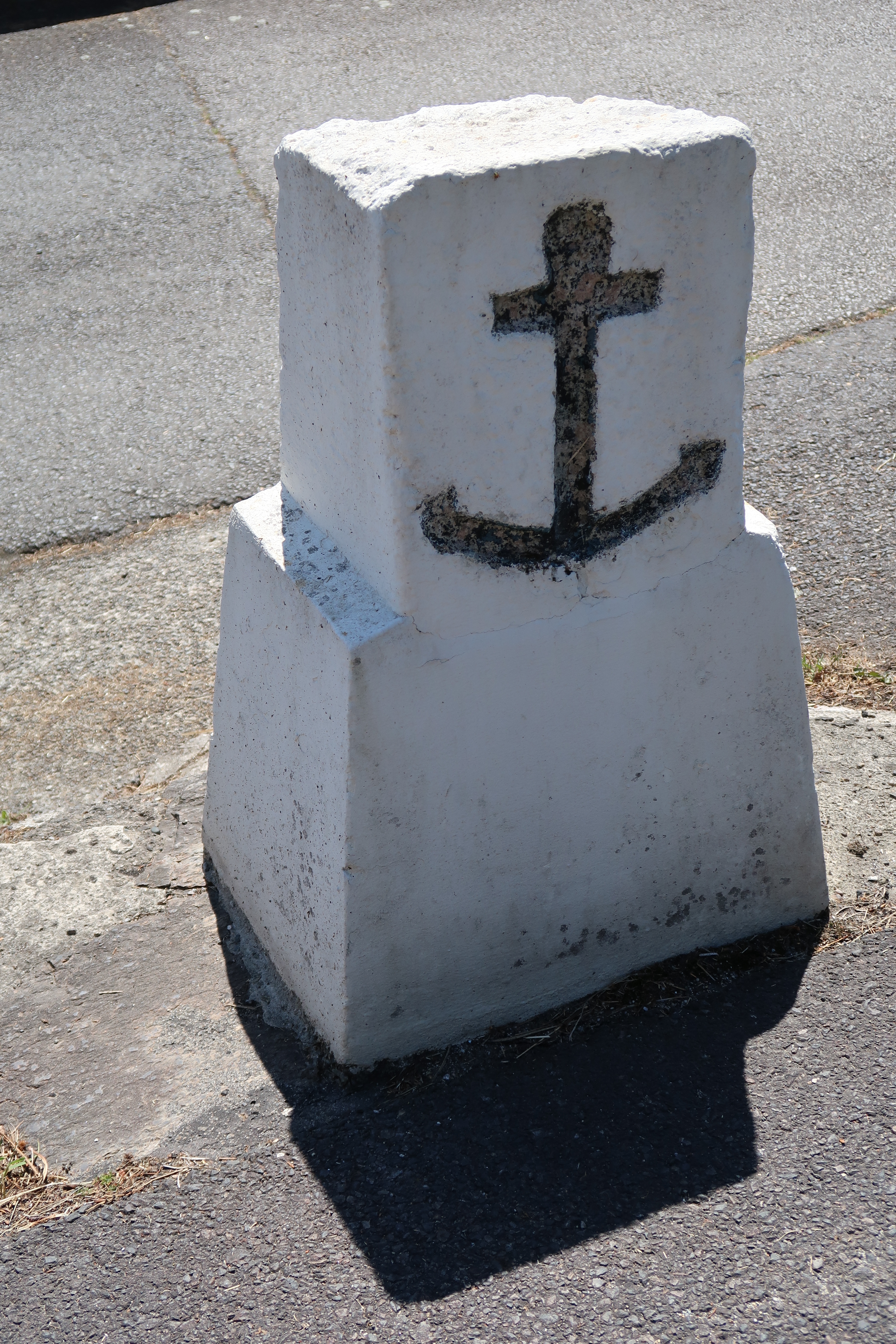 Vue d'une borne en granite sculptée d'une ancre de marine délimitant le terrain de la Villeneuve (état en 2022)Immatriculation