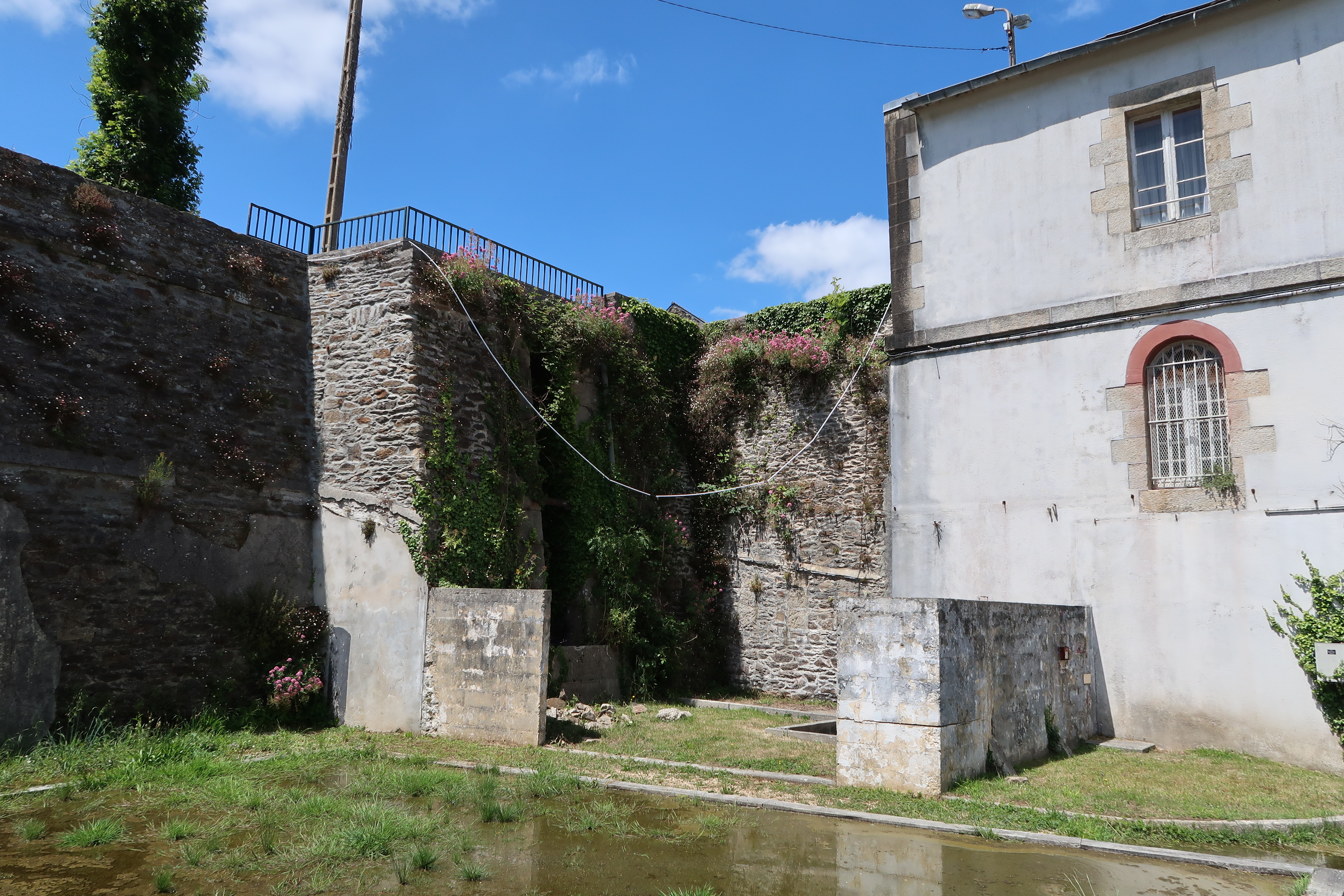 Vue de l'extrémité ouest faisant face à la digue de l'étang (état en 2022). Au premier étage, fenêtres à linteau en arc segmentaire ; au deuxième étage, fenêtres à linteau droit et chaînage d'angle en granite ; entre les premier et deuxième étages, bandeau en graniteImmatriculation