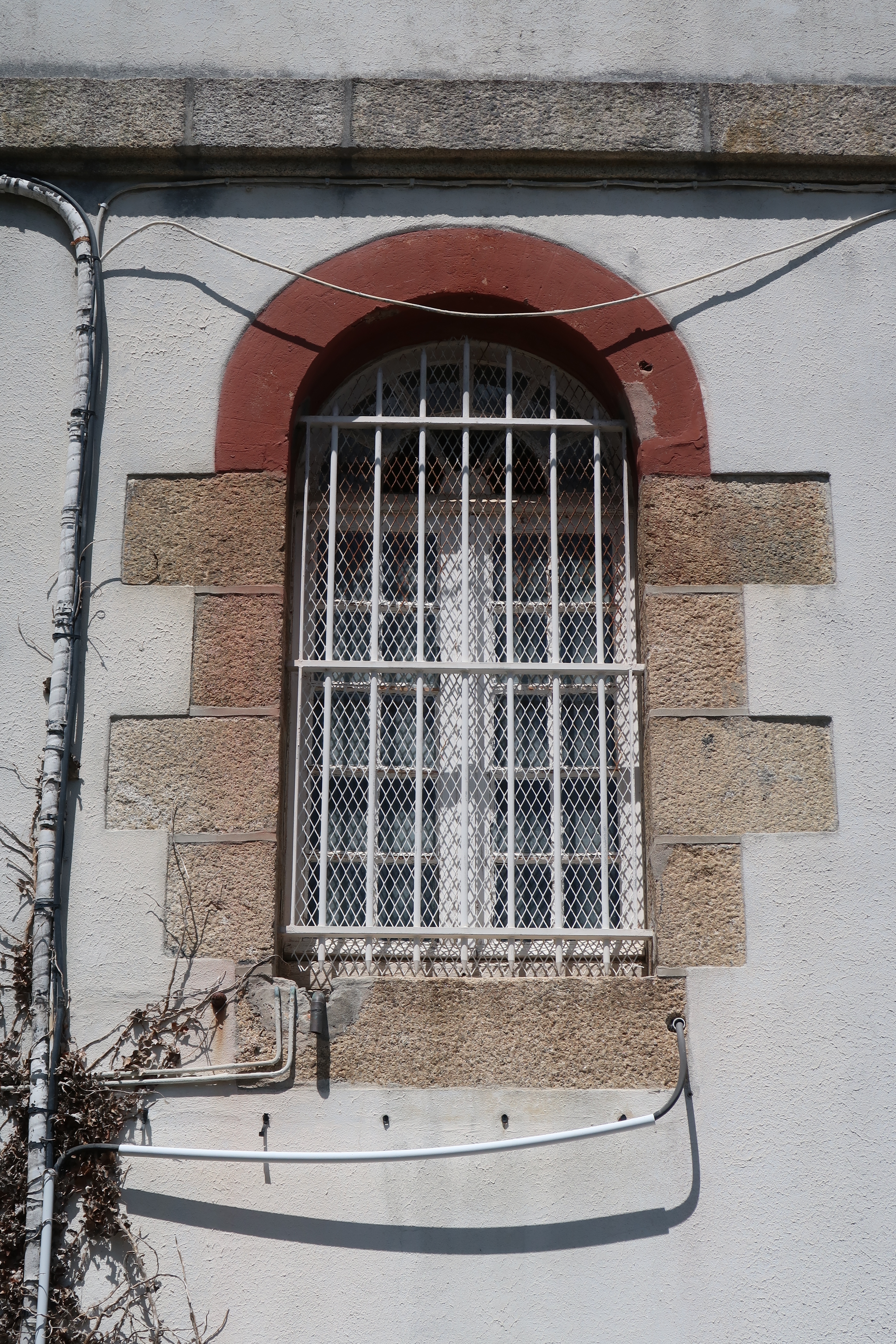 Vue de l'une des fenêtres avec linteau en arc plein cintre, grille et barreaux (état en 2022)Immatriculation