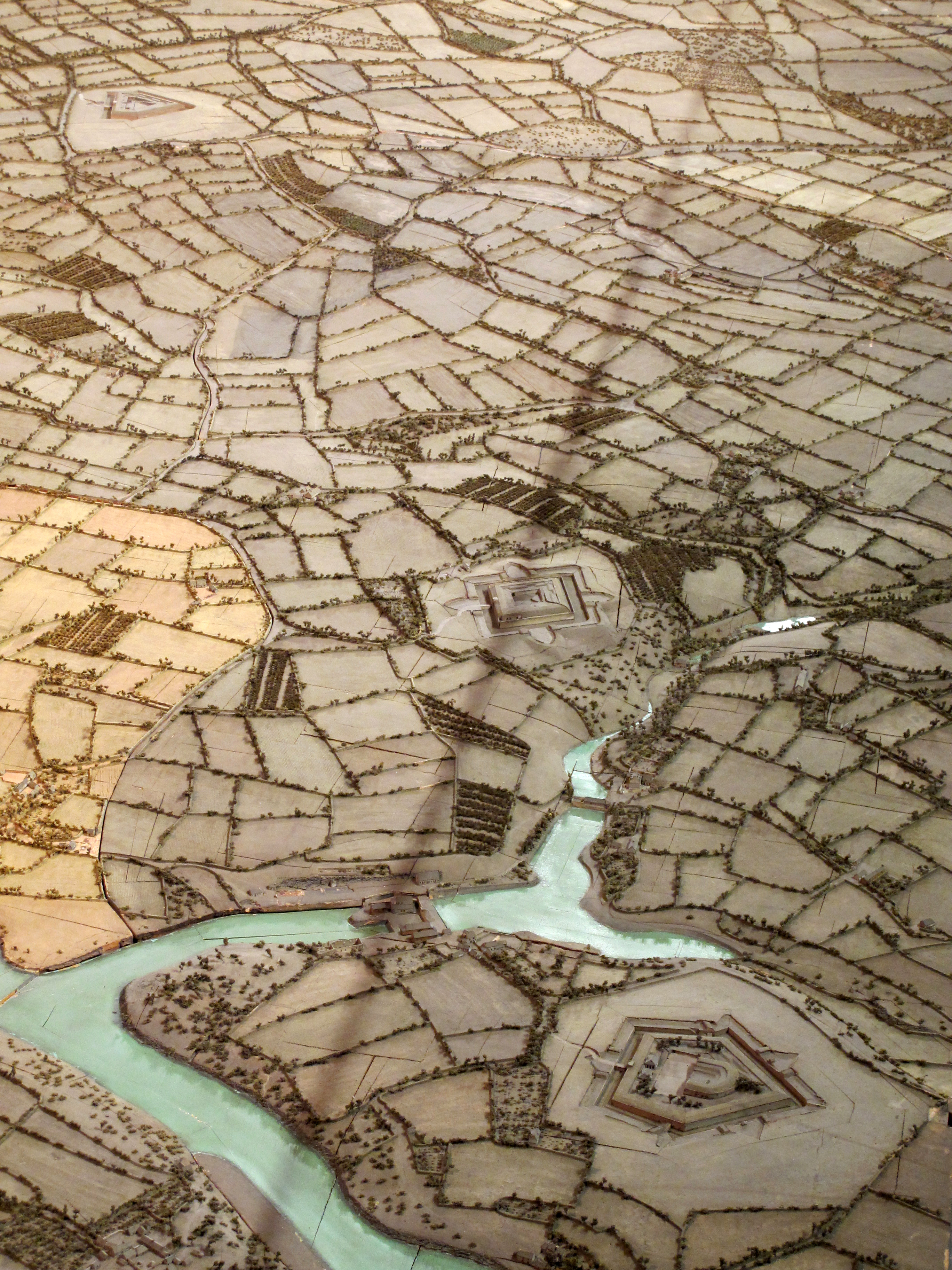 Vue de situation des forges de la Villeneuve depuis le nord sur le plan-relief de Brest (1807-1811). Les forges sont implantées sur la Penfeld entre le Fort de Penfeld et la Redoute de Questel. En arrière-plan à gauche, le Fort de KeranrouxImmatriculation