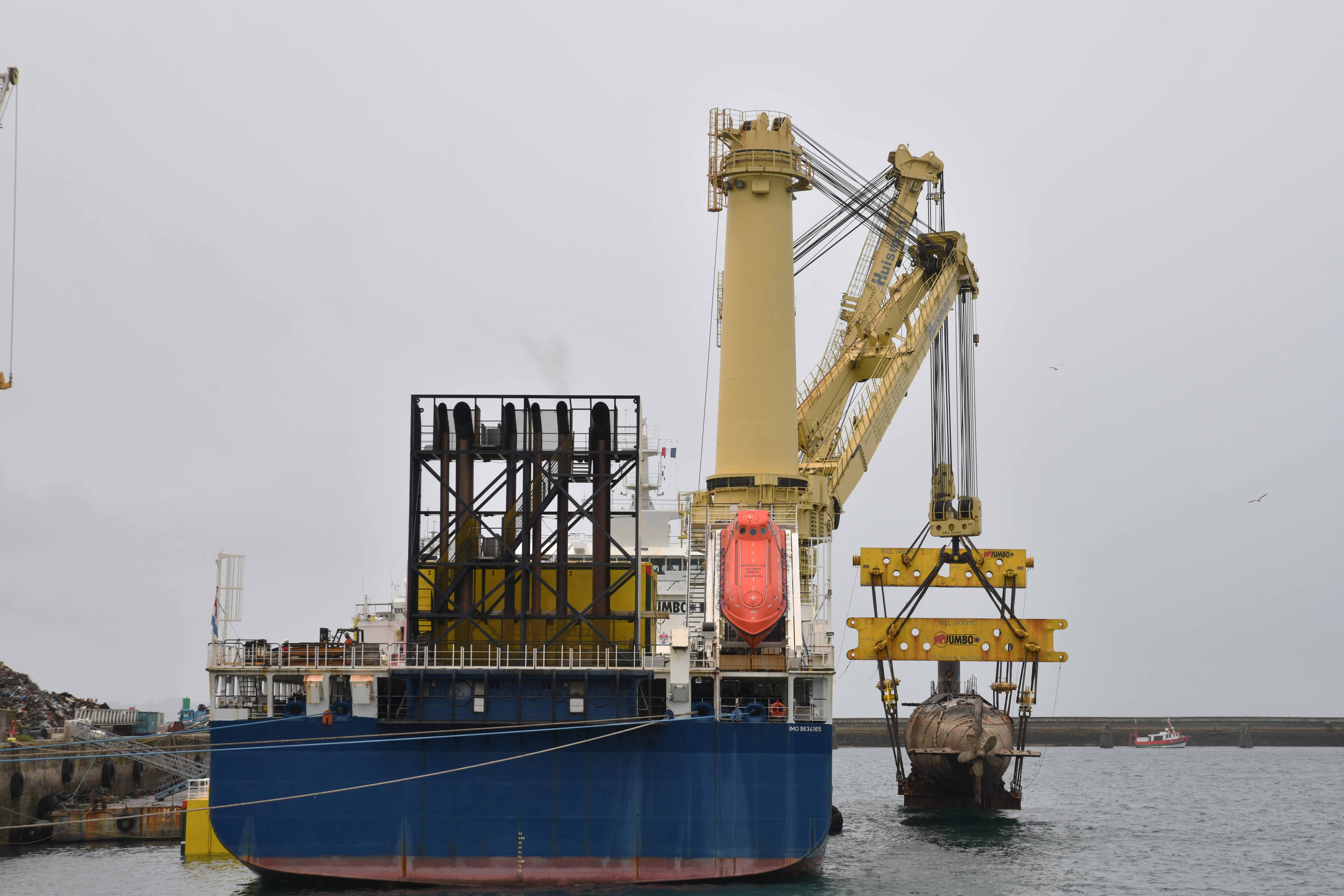 Déchargement de la coque de l’Agosta depuis le pont du Jumbo Kinetic au port de Brest, 6 août 2021Immatriculation