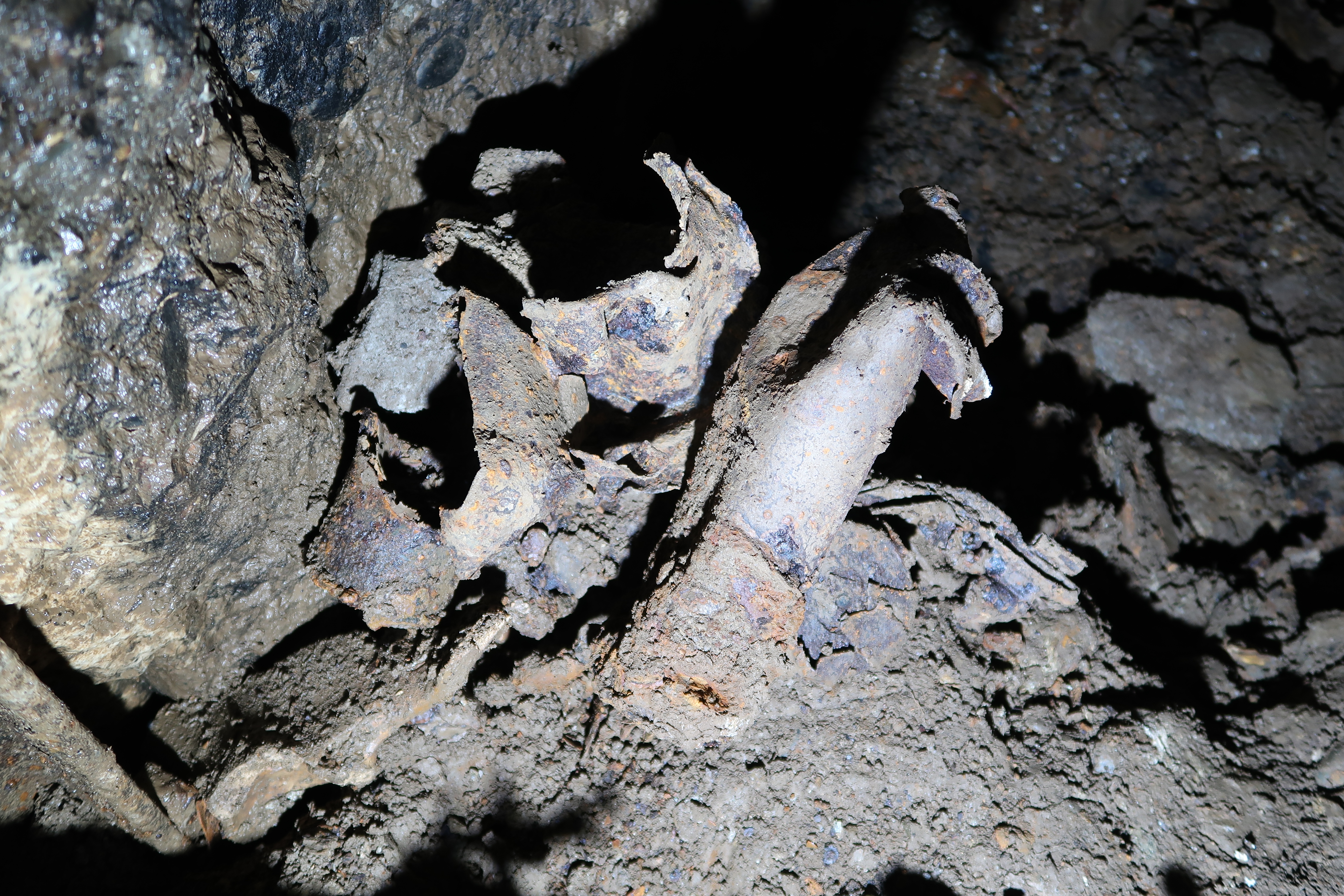 Vue de détail de débris métalliques de caisses d'obus et obus brisésImmatriculation