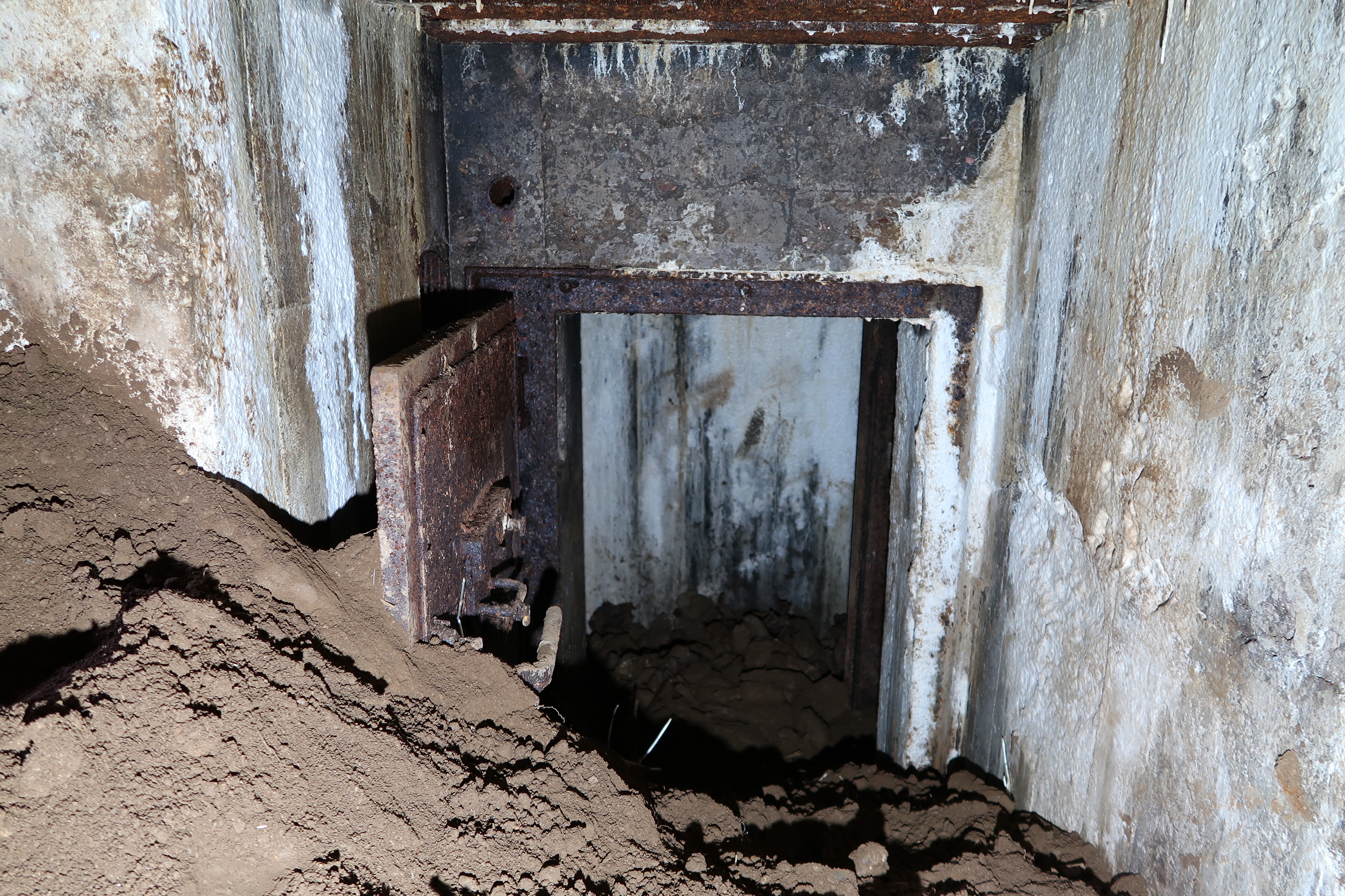 Vue du couloir d'entrée en partie remblayé : porte blindée du sas (à gauche)Immatriculation